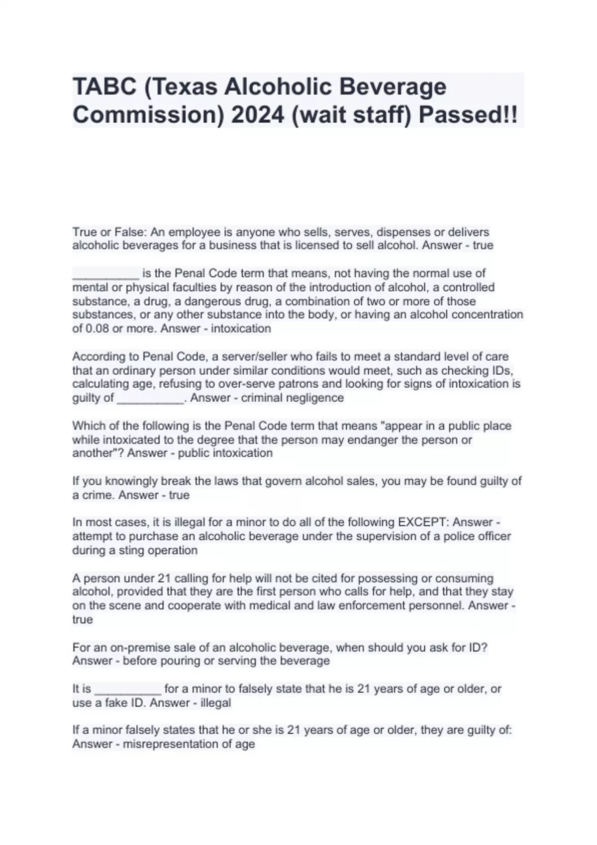 TABC (Texas Alcoholic Beverage Commission) 2024 (wait staff) Passed!!