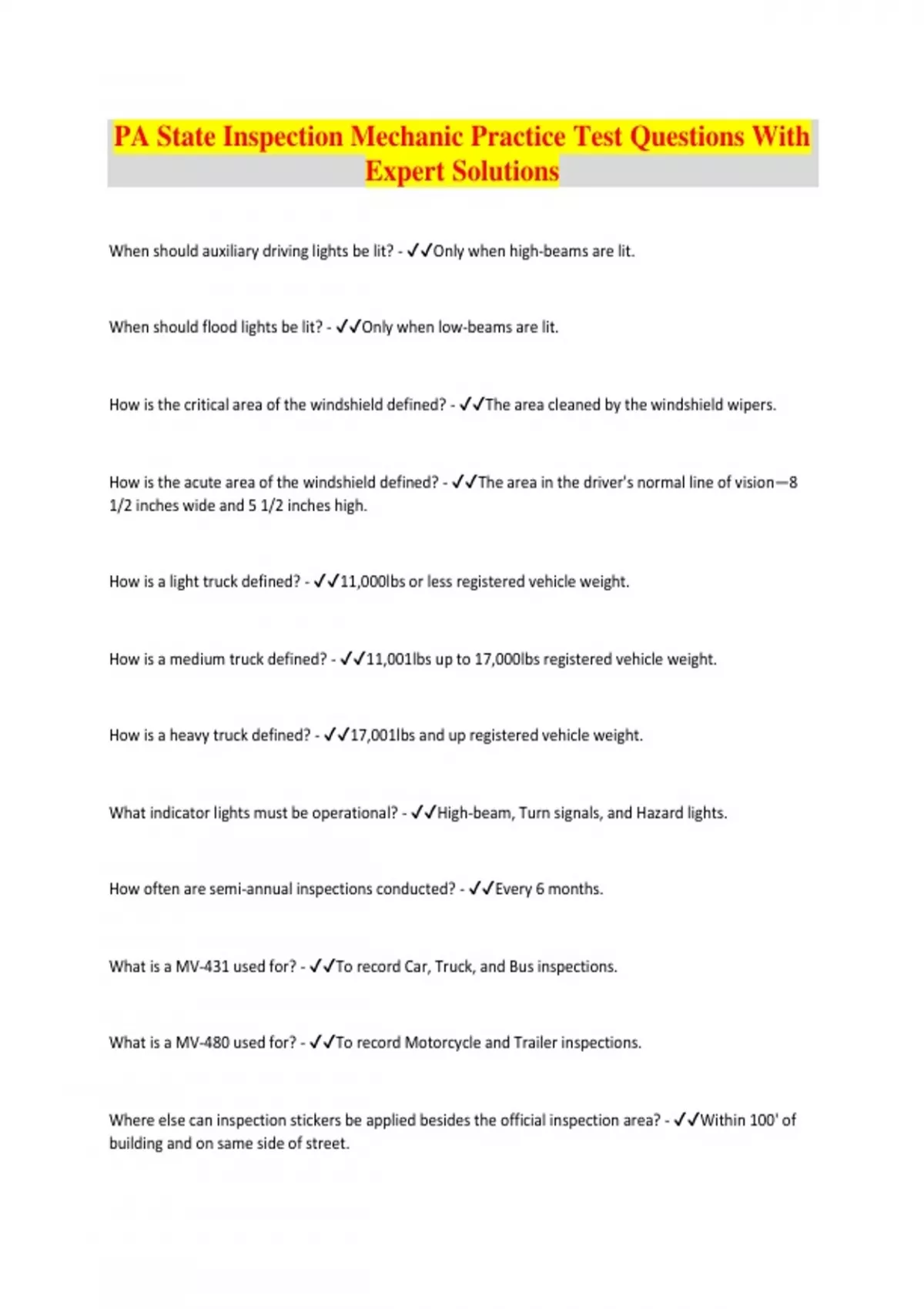PA State Inspection Mechanic Practice Test Questions With Expert Solutions When should auxiliary driving lights be lit? - Only when high-beams are lit. When should flood lights be lit? - Only when low-beams are lit. How is the critical area of the windshield defined? - The area cleaned by the windshield wipers. How is the acute area of the windshield defined? - The area in the driver's normal line of vision—8 1/2 inches wide and 5 1/2 inches high. How is a light truck defined? - 11,000lbs or less registered vehicle weight. How is a medium truck defined? - 11,001lbs up to 17,000lbs registered vehicle weight. How is a heavy truck defined? - 17,001lbs and up registered vehicle weight