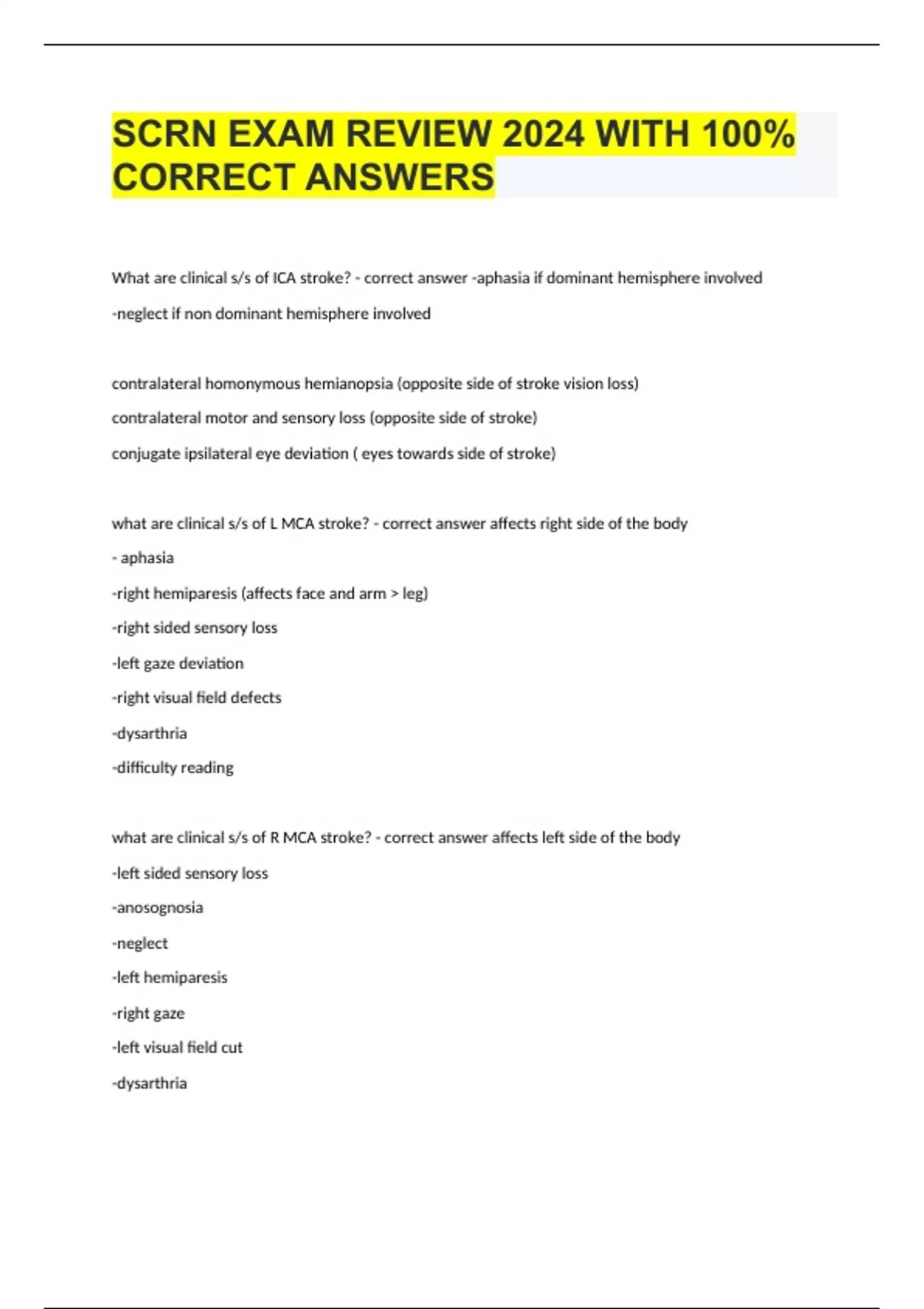 What are clinical s/s of ICA stroke? - correct answer -aphasia if dominant hemisphere involved -neglect if non dominant hemisphere involved contralateral homonymous hemianopsia (opposite side of stroke vision loss) contralateral motor and sensory loss (opposite side of stroke) conjugate ipsilateral eye deviation ( eyes towards side of stroke) what are clinical s/s of L MCA stroke? - correct answer affects right side of the body - aphasia -right hemiparesis (affects face and arm leg) -right sided sensory loss -left gaze deviation -right visual field defects -dysarthria -difficulty reading what are clinical s/s of R MCA stroke? - correct answer affects left side of the body -left sided sensory loss -a