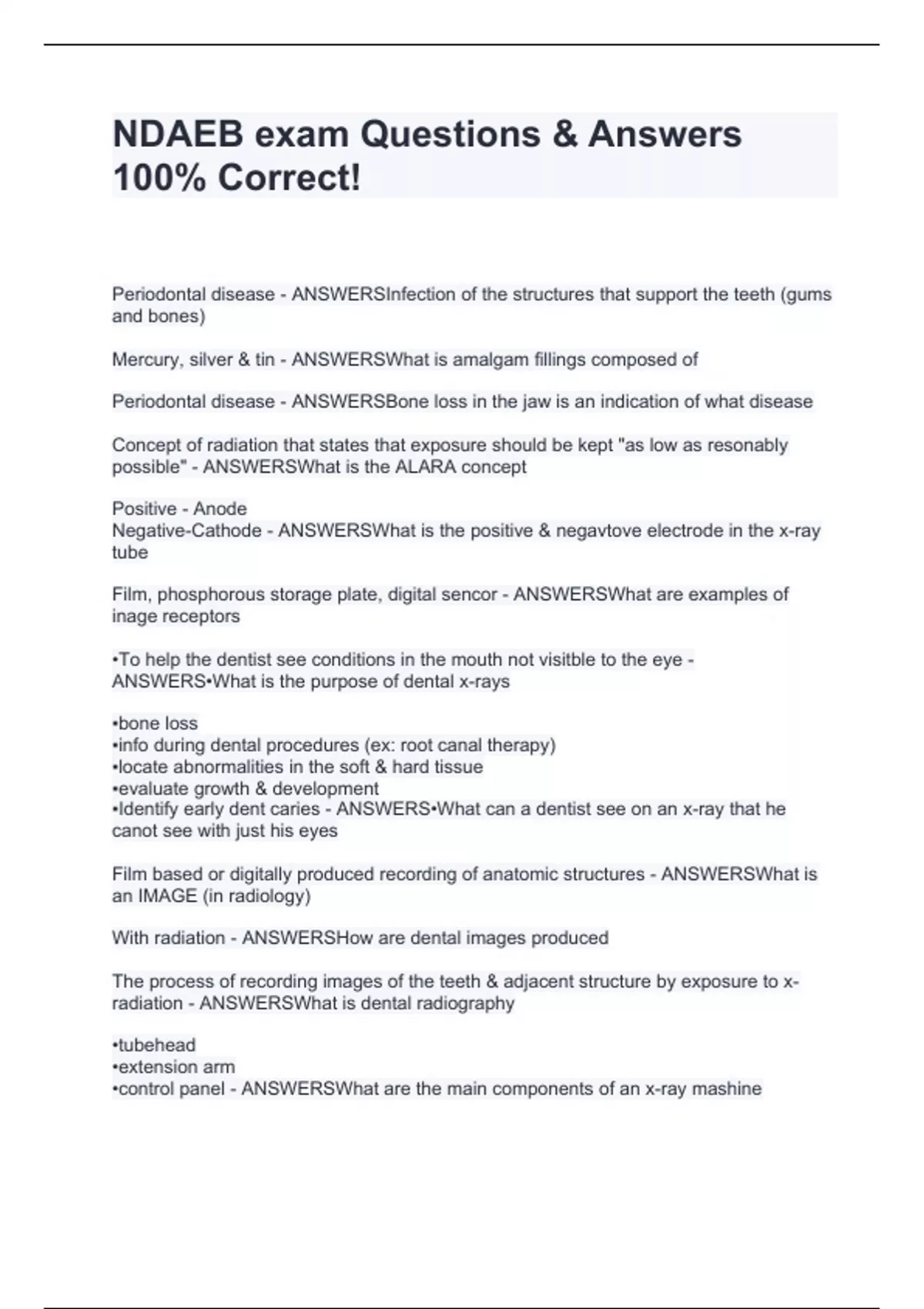 Periodontal disease - ANSWERSInfection of the structures that support the teeth (gums and bones) Mercury, silver & tin - ANSWERSWhat is amalgam fillings composed of Periodontal disease - ANSWERSBone loss in the jaw is an indication of what disease Concept of radiation that states that exposure should be kept "as low as resonably possible" - ANSWERSWhat is the ALARA concept Positive - Anode Negative-Cathode - ANSWERSWhat is the positive & negavtove electrode in the x-ray tube Film, phosphorous storage plate, digital sencor - ANSWERSWhat are examples of inage receptors •To help the dentist see conditions in the mouth not visitble to the eye - ANSWERS•What is the purpose of dental x-rays ▪bone loss ▪info during dental procedures (ex: root canal therapy) ▪locate abnormalities in the soft & hard tissue ▪evaluate growth & development ▪Identify early dent caries - ANSWERS•What can a dentist see on an x-ray that he canot see with just his eyes Film based or digitally produced recording of anatomic structures - ANSWERSWhat is an IMAGE (in radiology) With radiation - ANSWERSHow are dental images produced The process of recording images of the teeth & adjacent structure by exposure to x-radiation - ANSWERSWhat is dental radiography •tubehead •extension arm •control panel - ANSWERS