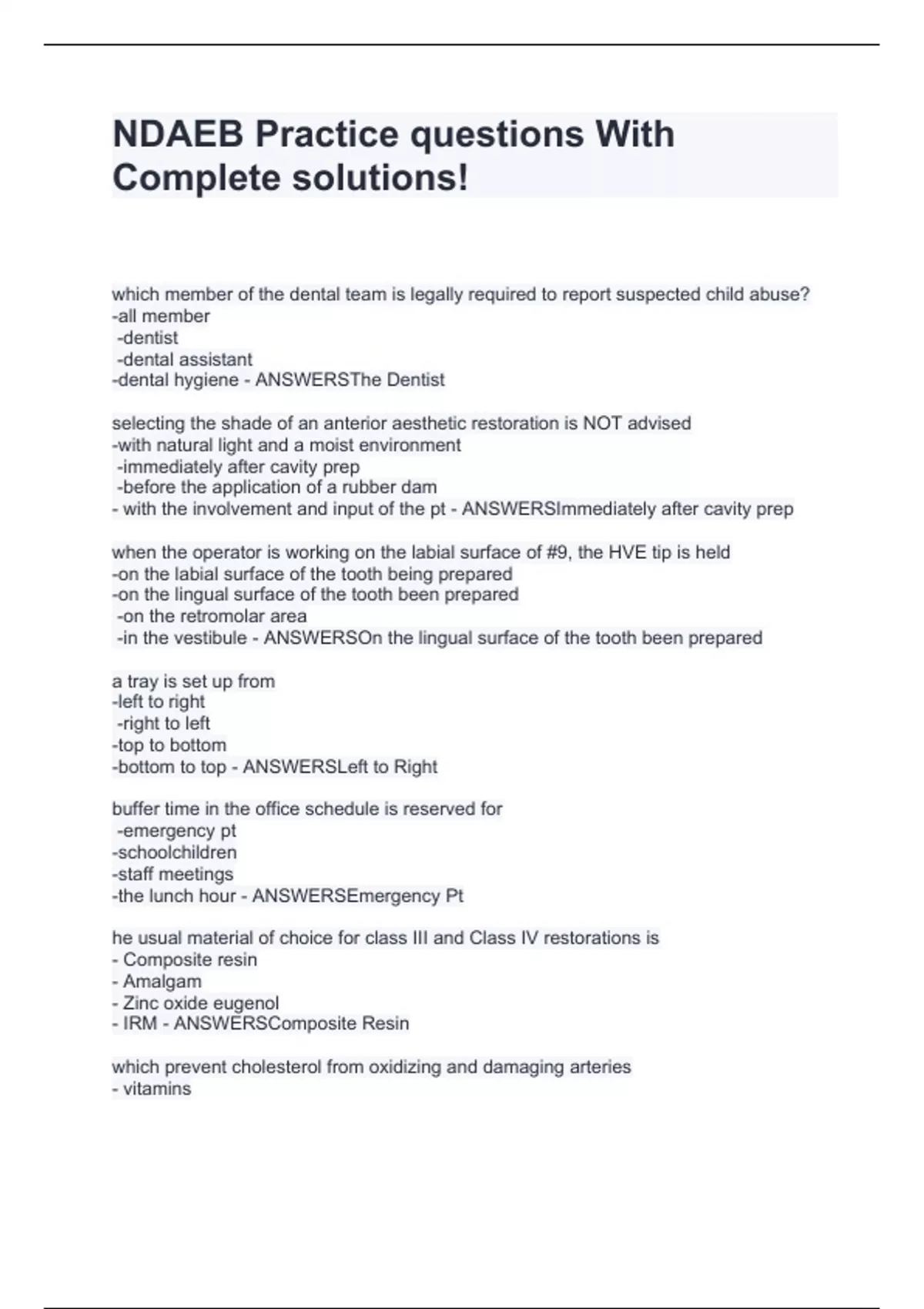 which member of the dental team is legally required to report suspected child abuse? -all member -dentist -dental assistant -dental hygiene - ANSWERSThe Dentist selecting the shade of an anterior aesthetic restoration is NOT advised -with natural light and a moist environment -immediately after cavity prep -before the application of a rubber dam - with the involvement and input of the pt - ANSWERSImmediately after cavity prep when the operator is working on the labial surface of #9, the HVE tip is held -on the labial surface of the tooth being prepared -on the lingual surface of the tooth been prepared -on the retromolar area -in the vestibule - ANSWERSOn the lingual surface of the tooth been prepared a tray is set up from -left to right -right to left -top to bottom -bottom to top - ANSWERSLeft to Right buffer time in the office schedule is reserved for -emergency pt -schoolchildren -staff meetings -the lunch hour - ANSWERSEmergency Pt he usual material of choice for class III and Class IV restorations is - Composite resin - Amalgam - Zinc oxide eugenol - IRM - ANSWERSComposite Resin which prevent cholesterol from oxidizing and damaging arteries