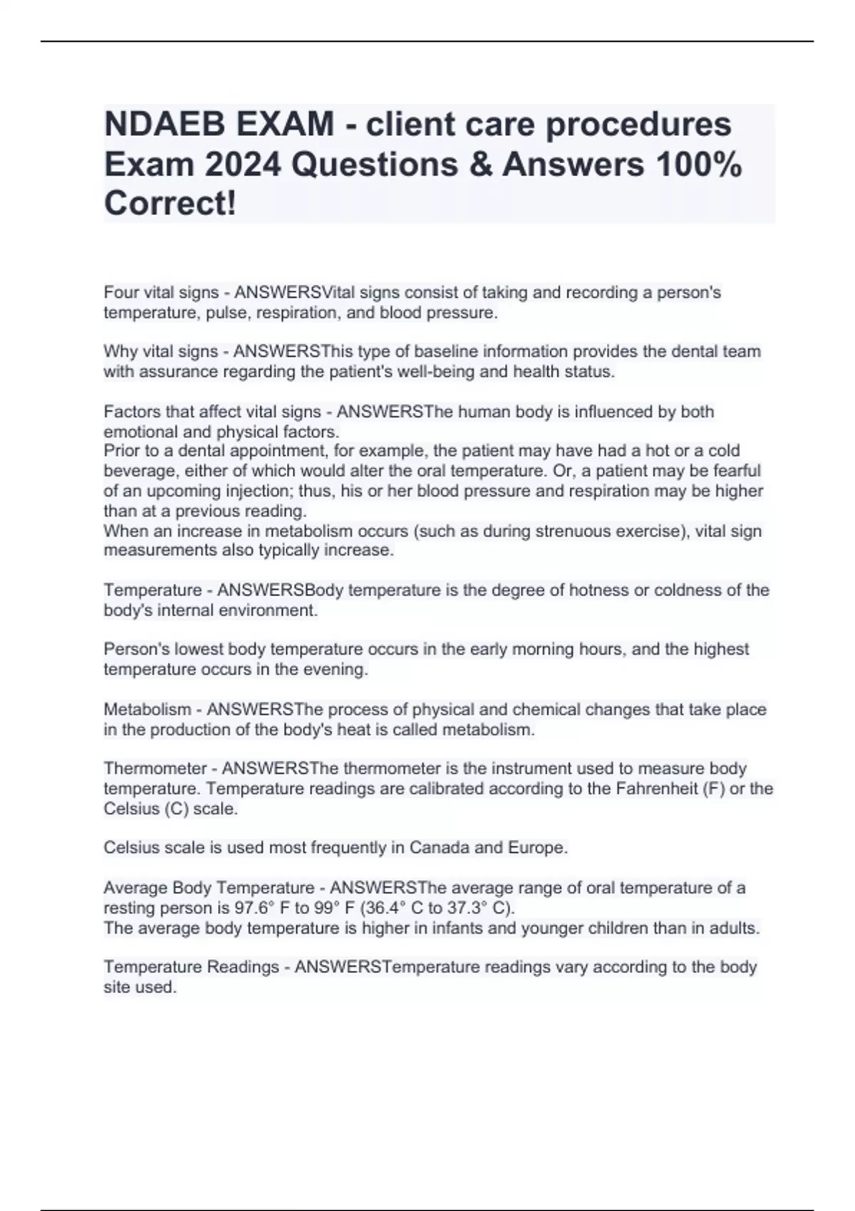 NDAEB EXAM - client care procedures Exam 2024 Questions & Answers 100% Correct!