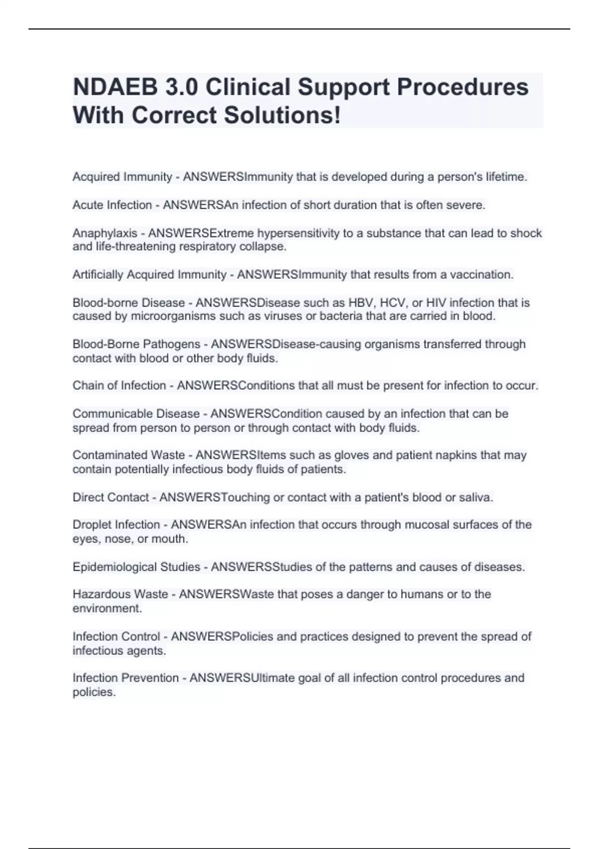 Acquired Immunity - ANSWERSImmunity that is developed during a person's lifetime. Acute Infection - ANSWERSAn infection of short duration that is often severe. Anaphylaxis - ANSWERSExtreme hypersensitivity to a substance that can lead to shock and life-threatening respiratory collapse. Artificially Acquired Immunity - ANSWERSImmunity that results from a vaccination. Blood-borne Disease - ANSWERSDisease such as HBV, HCV, or HIV infection that is caused by microorganisms such as viruses or bacteria that are carried in blood. Blood-Borne Pathogens - ANSWERSDisease-causing organisms transferred through contact with blood or other body fluids. Chain of Infection - ANSWERSConditions that all must be present for infection to occur. Communicable Disease - ANSWERSCondition caused by an infection that can be spread from person to person or through contact with body fluids. Contaminated Waste - ANSWERSItems such as gloves and patient napkins that may contain potentially infectious body fluids of patients. Direct Contact - ANSWERSTouching or contact with a patient's blood or saliva. Droplet Infection - ANSWERSAn infection that occurs through mucosal surfaces of the eyes, nose, or mouth. Epidemiological Studies - ANSWERSStudies of the patterns and causes of diseases. Hazardous Waste - ANSWERSWaste that poses a danger to humans or to the environment. Infection Control - ANSWERSPolicies and practices designed to prevent the spread of infectious agents. Infection Prevention - ANSWERSUltimate goal of all infection control procedures and policies.