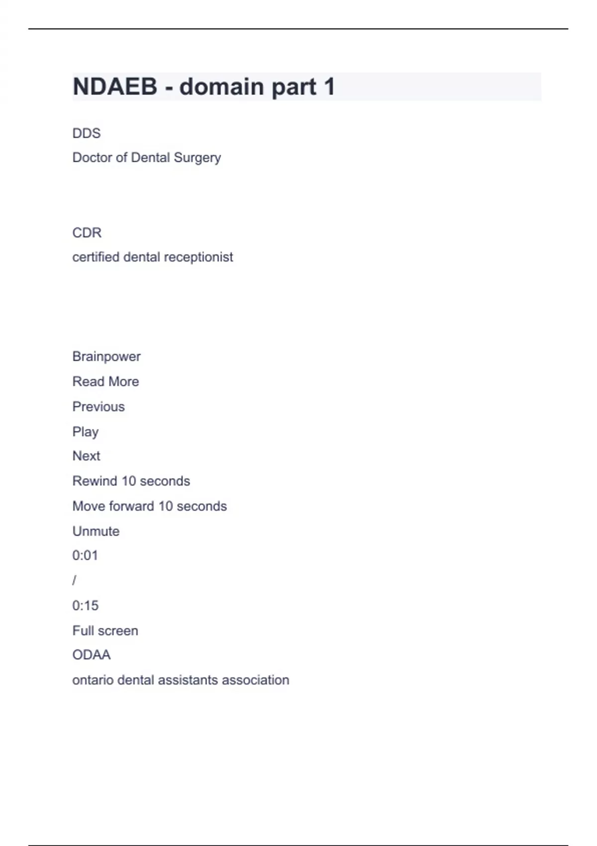 NDAEB Question and answers rated A+ 2024 DDS Doctor of Dental Surgery CDR certified dental receptionist Brainpower Read More Previous Play Next Rewind 10 seconds Move forward 10 seconds Unmute 0:01 / 0:15 Full screen ODAA ontario dental
