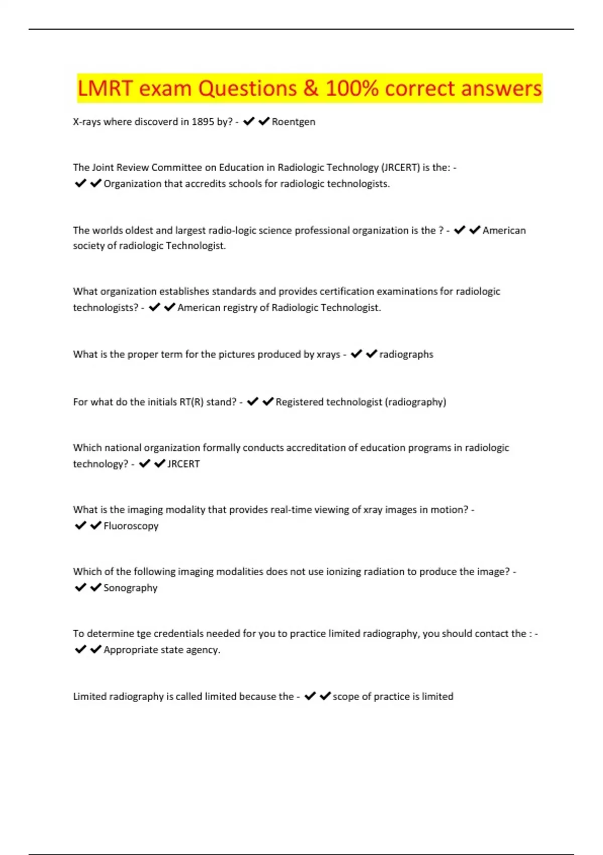 X-rays where discoverd in 1895 by? - Roentgen The Joint Review Committee on Education in Radiologic Technology (JRCERT) is the: - Organization that accredits schools for radiologic technologists. The worlds oldest and largest radio-logic science professional organization is the ? - American society of radiologic Technologist. What organization establishes standards and provides certification examinations for radiologic technologists? - American registry of Radiologic Technologist. What is the proper term for the pictures produced by xrays - radiographs