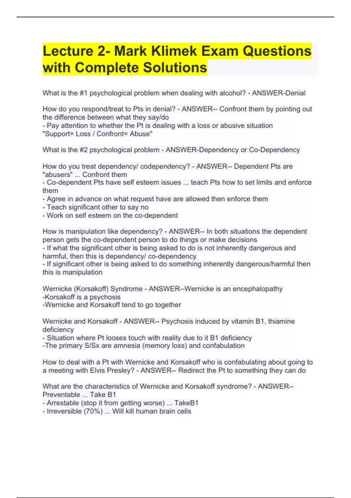 What is the #1 psychological problem when dealing with alcohol? - ANSWER-Denial How do you respond/treat to Pts in denial? - ANSWER-- Confront them by pointing out the difference between what they say/do - Pay attention to whether the Pt is dealing with a loss or abusive situation "Support= Loss / Confront= Abuse" What is the #2 psychological problem - ANSWER-Dependency or Co-Dependency How do you treat dependency/ codependency? - ANSWER-- Dependent Pts are "abusers" ... Confront them - Co-dependent Pts have self esteem issues ... teach Pts how to set limits and enforce them - Agree in advance on what request have are allowed then enforce them - Teach significant other to say no - Work on self esteem on the co-dependent How is manipulation like dependency? - ANSWER-- In both situations the dependent person gets the co-dependent person to do things or make decisions - If what the significant other is being asked to do is not inherently dangerous and harmful, then this is dependency/ co-dependency - If significant other is being asked to do something inherently dangerous/harmful then this is manipulation Wernicke (Korsakoff) Syndrome - ANSWER--Wernicke is an encephalopathy -Korsakoff is a psychosis -Wernicke and Korsakoff tend to go together Wernicke and Korsakoff - ANSWER-- Psychosis induced by vitamin B1, thiamine deficiency - Situation where Pt looses touch with reality due to it B1 deficiency -The primary S/Sx are amnesia (memory loss) and confabulation How to deal with a Pt with Wernicke and Korsakoff who is confabulating about going to a meeting with Elvis Presley? - ANSWER-- Redirect the Pt to something they can do What are the characteristics of Wernicke and Korsakoff syndrome? - ANSWER-- Preventable ... Take B1 - Arrestable (stop it from getting worse) ... TakeB1 - Irreversible (70%) ... Will kill human brain cells