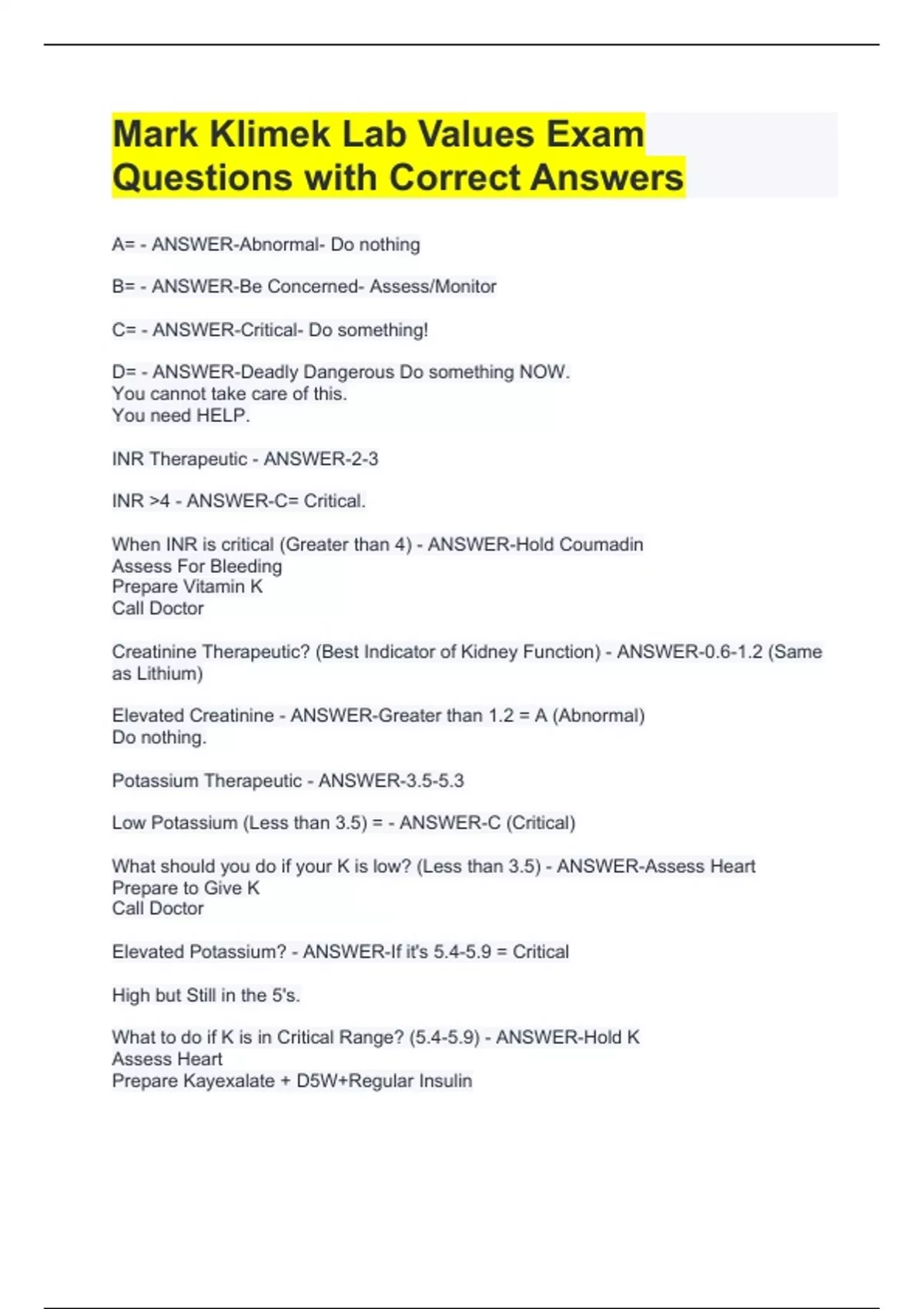A= - ANSWER-Abnormal- Do nothing B= - ANSWER-Be Concerned- Assess/Monitor C= - ANSWER-Critical- Do something! D= - ANSWER-Deadly Dangerous Do something NOW. You cannot take care of this. You need HELP. INR Therapeutic - ANSWER-2-3 INR >4 - ANSWER-C= Critical. When INR is critical (Greater than 4) - ANSWER-Hold Coumadin Assess For Bleeding Prepare Vitamin K Call Doctor Creatinine Therapeutic? (Best Indicator of Kidney Function) - ANSWER-0.6-1.2 (Same as Lithium) Elevated Creatinine - ANSWER-Greater than 1.2 = A (Abnormal) Do nothing. Potassium Therapeutic - ANSWER-3.5-5.3 Low Potassium (Less than 3.5) = - ANSWER-C (Critical) What should you do if your K is low? (Less than 3.5) - ANSWER-Assess Heart Prepare to Give K Call Doctor Elevated Potassium? - ANSWER-If it's 5.4-5.9 = Critical High but Still in the 5's. What to do if K is in Critical Range? (5.4-5.9) - ANSWER-Hold K Assess Heart Prepare Kayexalate + D5W+Regular Insulin