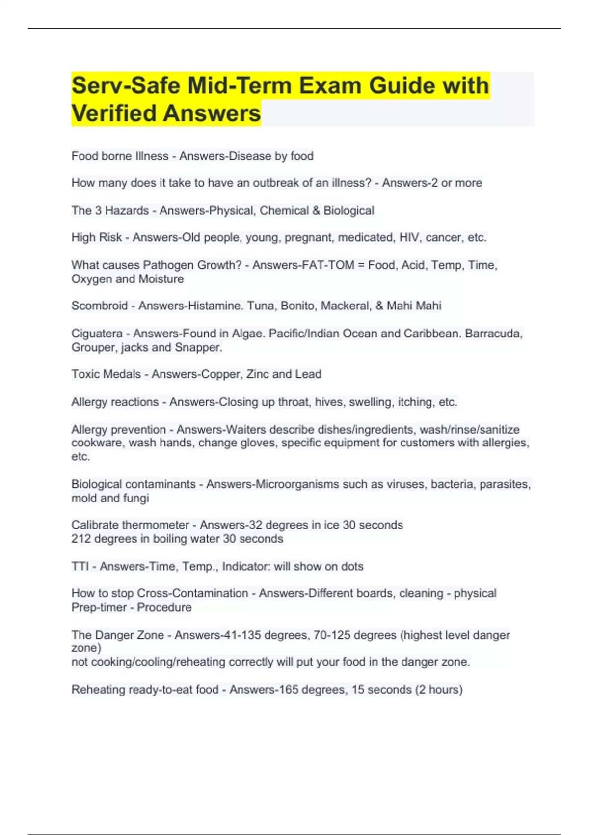 Serv-Safe Mid-Term Exam Test Guide with Verified Answers