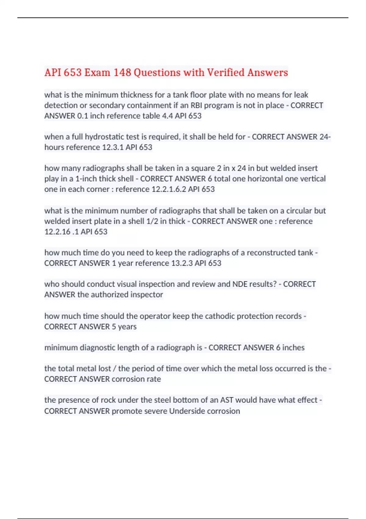 API 653 Exam 148 Questions with Verified Answers what is the minimum thickness for a tank floor plate with no means for leak detection or secondary containment if an RBI program is not in place - CORRECT ANSWER 0.1 inch reference table 4.4 API 653 when a full hydrostatic test is required, it shall be held for - CORRECT ANSWER 24-hours reference 12.3.1 API 653 how many radiographs shall be taken in a square 2 in x 24 in but welded insert play in a 1-inch thick shell - CORRECT ANSWER 6 total one horizontal one vertical one in each corner : reference 12.2.1.6.2 API 653 what is the minimum number of radiographs that shall be taken on a circular but welded insert plate in a shell 1/2 in thick - CORRECT ANSWER one : reference 12.2.16 .1 API 653 how much time do you need to keep the radiographs of a reconstructed tank - CORRECT ANSWER 1 year reference 13.2.3 API 653 who should conduct visual inspection and review and NDE results? - CORRECT ANSWER the authorized inspector how much time should the operator keep the cathodic protection records - CORRECT ANSWER 5 years minimum diagnostic length of a radiograph is - CORRECT ANSWER 6 inches the total metal lost / the period of time over which the metal loss occurred is the - CORRECT ANSWER corrosion rate the presence of rock under the steel bottom of an AST would have what effect - CORRECT ANSWER promote severe Underside corrosion when do you use thin-film linings - CORRECT ANSWER when the tank is new or has light corrosion a formal visual external inspection by an authorized inspector shall be made - CORRECT ANSWER at least every five years or RCA / 4N years whichever is less radiographic density shall be check by densitometer calibrated on a step wedge film traceable to - CORRECT ANSWER a National Standard a welder deposits more metal than Allowed by the WPS what should be done - CORRECT ANSWER re-qualify the welder what is the maximum critical length for plate thickness determination - CORRECT ANSWER 40 inches when is it necessary for a hydrostatic test on a reconstructed tank - CORRECT ANSWER always between thin film and thick film Linings which lining is best for crude oil tank that operates at 190 degrees F - CORRECT ANSWER thin film what is the maximum spacing for MT prods - CORRECT ANSWER 8 inches what is the height of the lead symbol B that shall be attached to the back of each film holder during each exposure to determine if Backscatter radiation is exposing the film - CORRECT ANSWER 1/2 inch any work on a tank that changes its physical dimensions or configuration is called an - CORRECT ANSWER alteration which Annex of API 653 provides guides about above ground storage tanks inspector certification - CORRECT ANSWER Annex D the maximum permissible limit of exposure to organic lead in a normal 8 hour work day is - CORRECT ANSWER 2 micrograms of organic lead per cubic feet the full course width for shell plate as per API 650 shall be a minimum of - CORRECT ANSWER 72 in in accordance with API standard 653, critical zone for repairs to a tank bottom is that portion, which is - CORRECT ANSWER measured radially inward within 3 inches of the Inside Edge of the shell as per API standard 653 a routine in-service visual external inspection of an above ground storage tank shall be done every - CORRECT ANSWER one month how many types of authorized inspection agencies can exist - CORRECT ANSWER four types who has ultimate responsibility for complying with the provisions of the API 653 standard - CORRECT ANSWER the owner-operator jacking of a tank is an alteration or repair - CORRECT ANSWER repair in which case is external inspection permitted in lieu of internal inspection - CORRECT ANSWER when you have access to the underside of the bottom does a relocated tank need hydrostatic testing - CORRECT ANSWER yes which nde technique is used to fully check shell welds - CORRECT ANSWER hydrostatic testing reinforcement pad welds should be pneumatically tested at which pressure - CORRECT ANSWER 15 PSIG during a hydrostatic test at least how many measurement points shall be surveyed - CORRECT ANSWER 8 points during a hydrostatic test for a new tank at least how many measurements sets shall be taken - CORRECT ANSWER at least six sets which type of Tanks use wind girders - CORRECT ANSWER open-top tanks the total resistance of tank to Earth should not exceed approximately - CORRECT ANSWER 25 ohms vacuum box testing requires how many PSIG of vacuum minimum - CORRECT ANSWER 3 PSIG API 653 standard covers maintenance repair relocation and reconstruction of Tanks constructed according to what standards - CORRECT ANSWER API 650 and API 12C guided bend test are used to - CORRECT ANSWER determine the degree of soundness and ductility of Groove weld joints tension tests are used to - CORRECT ANSWER determined the ultimate strength of Groove weld joints how many tension tests are required for procedure qualification - CORRECT ANSWER two tension tests which nde technique are volumetric - CORRECT ANSWER radiography and ultrasound radiography can be used to qualify welders performance - CORRECT ANSWER true apart from 6G which pipe position can be used to qualify a welder for all other positions - CORRECT ANSWER 2G and 5G the 1 foot method designed shall not be used in tanks over which diameter - CORRECT ANSWER 200 ft maximum design internal pressure in an AST is not exceeding - CORRECT ANSWER 2.5 PSIG at which temperature is risk of brittle fracture is considered minimal - CORRECT ANSWER 50° f tank shell thickness below 1/2 inch is there risk of brittle fracture - CORRECT ANSWER no it is minimal an image quality indicator penetrameter is used to - CORRECT ANSWER determine the image quality of a radiograph API 650 limits design temperature to be no more than - CORRECT ANSWER 93° C or 200° Fahrenheit plate for reconstructed tank has been out in the open for more than 180 days can it be used for tank shells - CORRECT ANSWER yes but only with a UTM assessment if impact testing wa