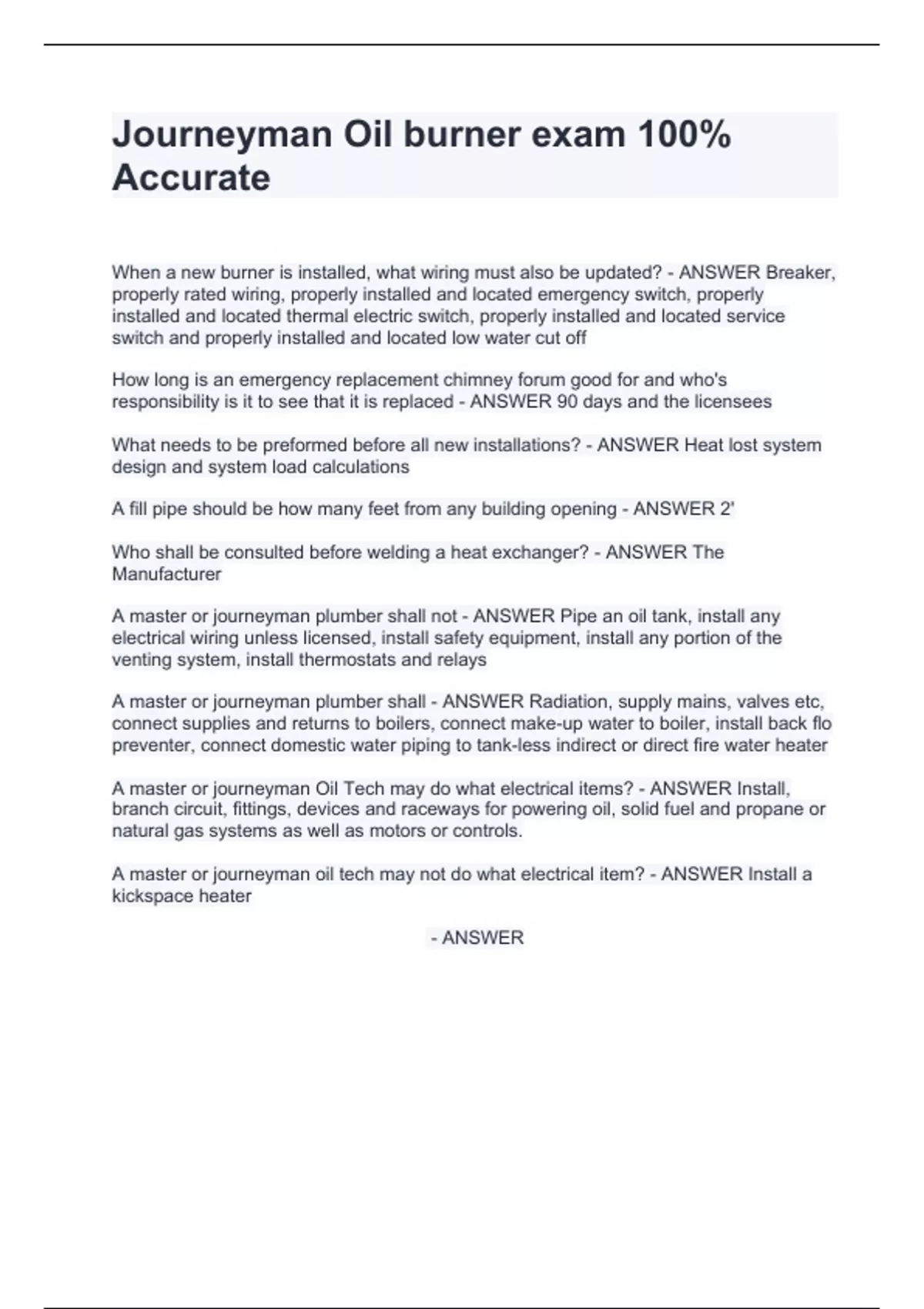 When a new burner is installed, what wiring must also be updated? - ANSWER Breaker, properly rated wiring, properly installed and located emergency switch, properly installed and located thermal electric switch, properly installed and located service switch and properly installed and located low water cut off How long is an emergency replacement chimney forum good for and who's responsibility is it to see that it is replaced - ANSWER 90 days and the licensees What needs to be preformed before all new installations? - ANSWER Heat lost system design and system load calculations A fill pipe should be how many feet from any building opening - ANSWER 2' Who shall be consulted before welding a heat exchanger? - ANSWER The Manufacturer