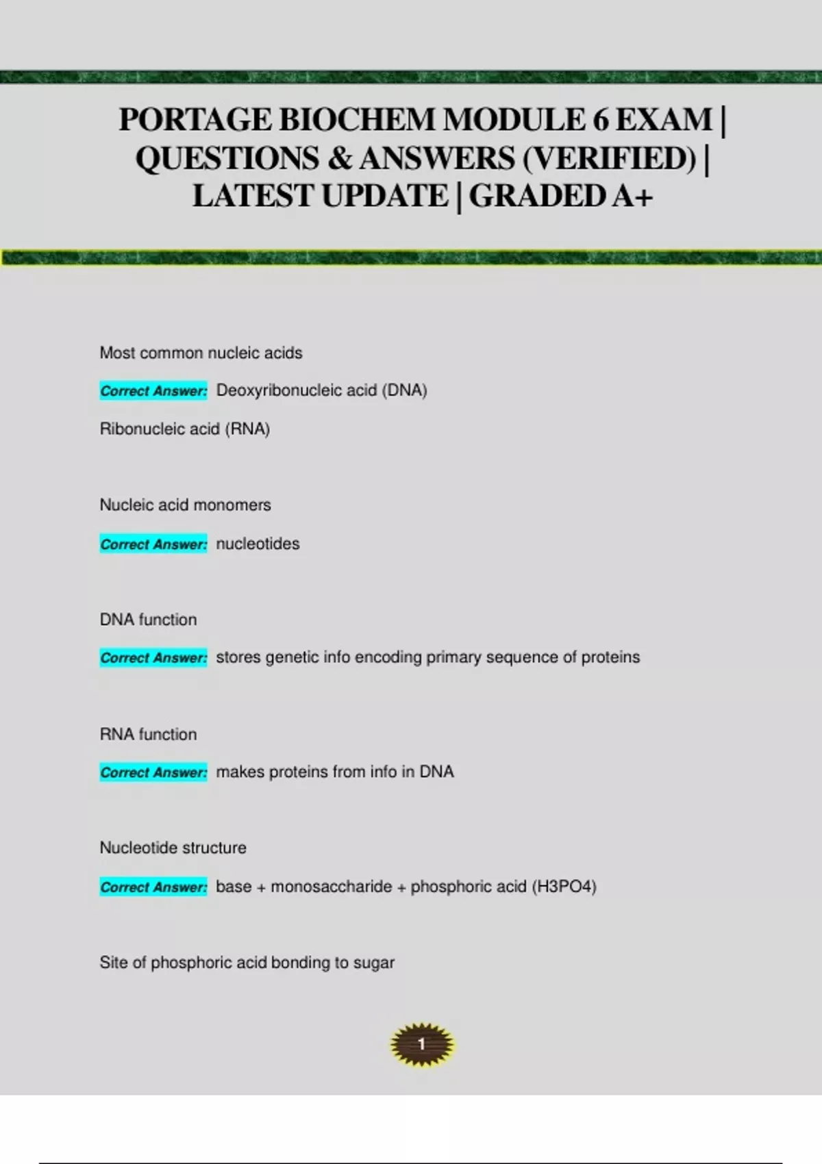 PORTAGE BIOCHEM MODULE 6 EXAM | QUESTIONS & ANSWERS (VERIFIED) | LATEST UPDATE | GRADED A+ Most common nucleic acids Correct Answer: Deoxyribonucleic acid (DNA) Ribonucleic acid (RNA) Nucleic acid monomers Correct Answer: nucleotides DNA function Correct Answer: stores genetic info encoding primary sequence of proteins RNA function Correct Answer: makes proteins from info in DNA Nucleotide structure Correct Answer: base + monosaccharide + phosphoric acid (H3PO4) Site of phosphoric acid bonding to sugar 2 Correct Answer: Carbon 5 Composition of bases Correct Answer: heterocyclic organic compounds containing N Purine structure Correct Answer: 2 rings fused together Purine bases Correct Answer: Adenine and Guanine Pyramidine structure Correct Answer: single ring Pyramidine bases Correct Answer: Cytosine, thymine (DNA), uracil (RNA) Distinction between thymine and uracil Correct Answer: Thymine has an extra methyl group (looks like an antenna) RNA sugar Correct Answer: D-ribose; carbon 2 has an -OH grou