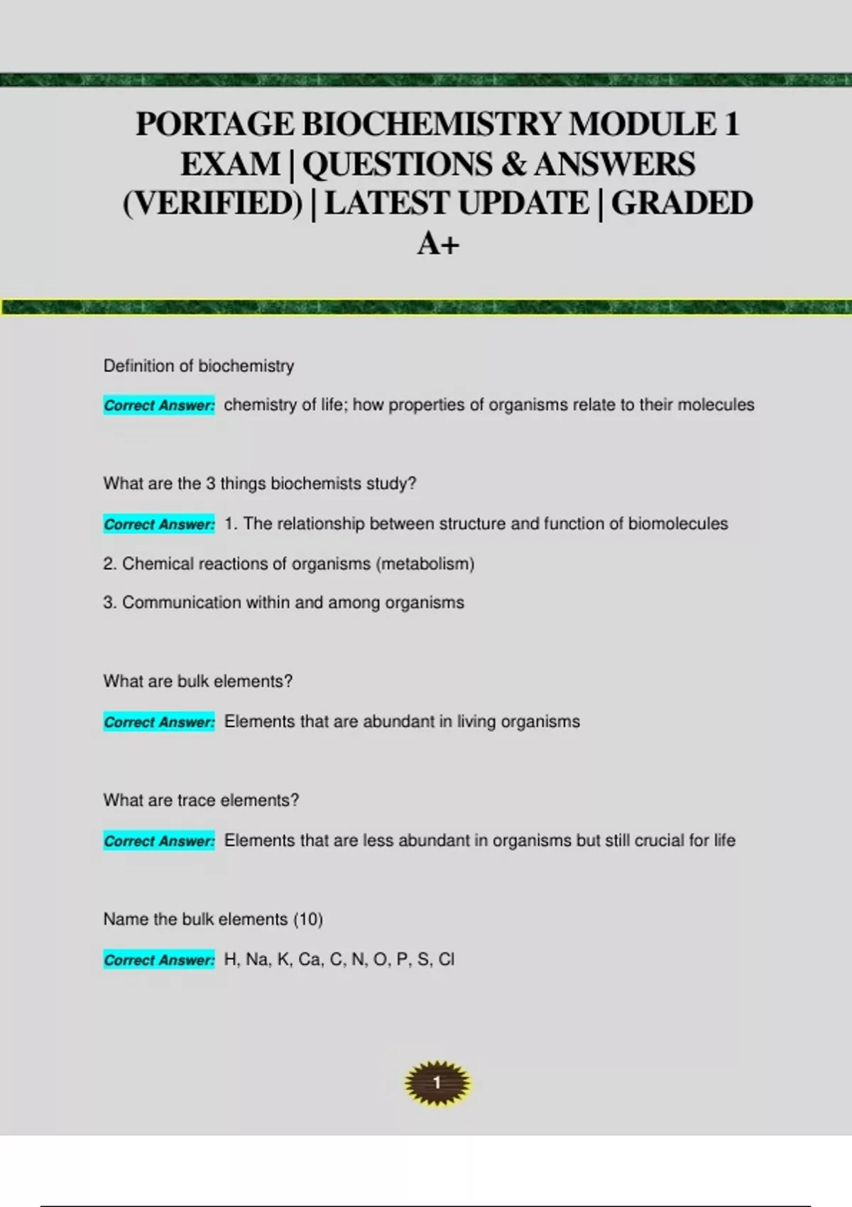 PORTAGE BIOCHEMISTRYMODULE 1 EXAM | QUESTIONS & ANSWERS (VERIFIED) | LATEST UPDATE | GRADED A+