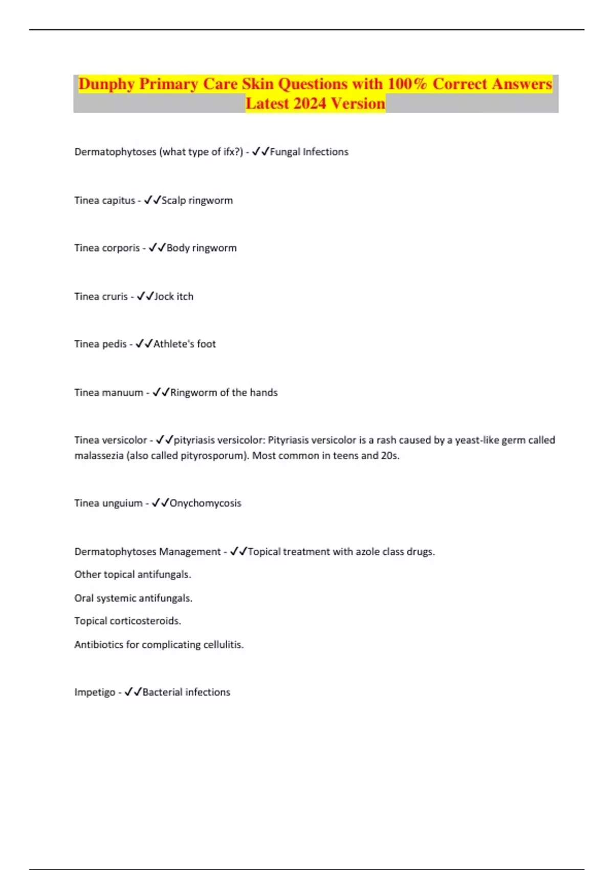 Dunphy Primary Care Skin Questions with 100% Correct Answers Latest 2024 Version Dermatophytoses (what type of ifx?) - Fungal Infections Tinea capitus - Scalp ringworm Tinea corporis - Body ringworm Tinea cruris - Jock itch Tinea pedis - Athlete's foot Tinea manuum - Ringworm of the hands Tinea versicolor - pityriasis versicolor: Pityriasis versicolor is a rash caused by a yeast-like germ called malassezia (also called pityrosporum). Most common in teens and 20s. Tinea unguium - Onychomycosis Dermatophytoses Management - Topical treatment with azole class drugs. Other topical antifungals. Oral systemic antifungals. Topical corticosteroids. Antibiotics for complicating cellulitis.