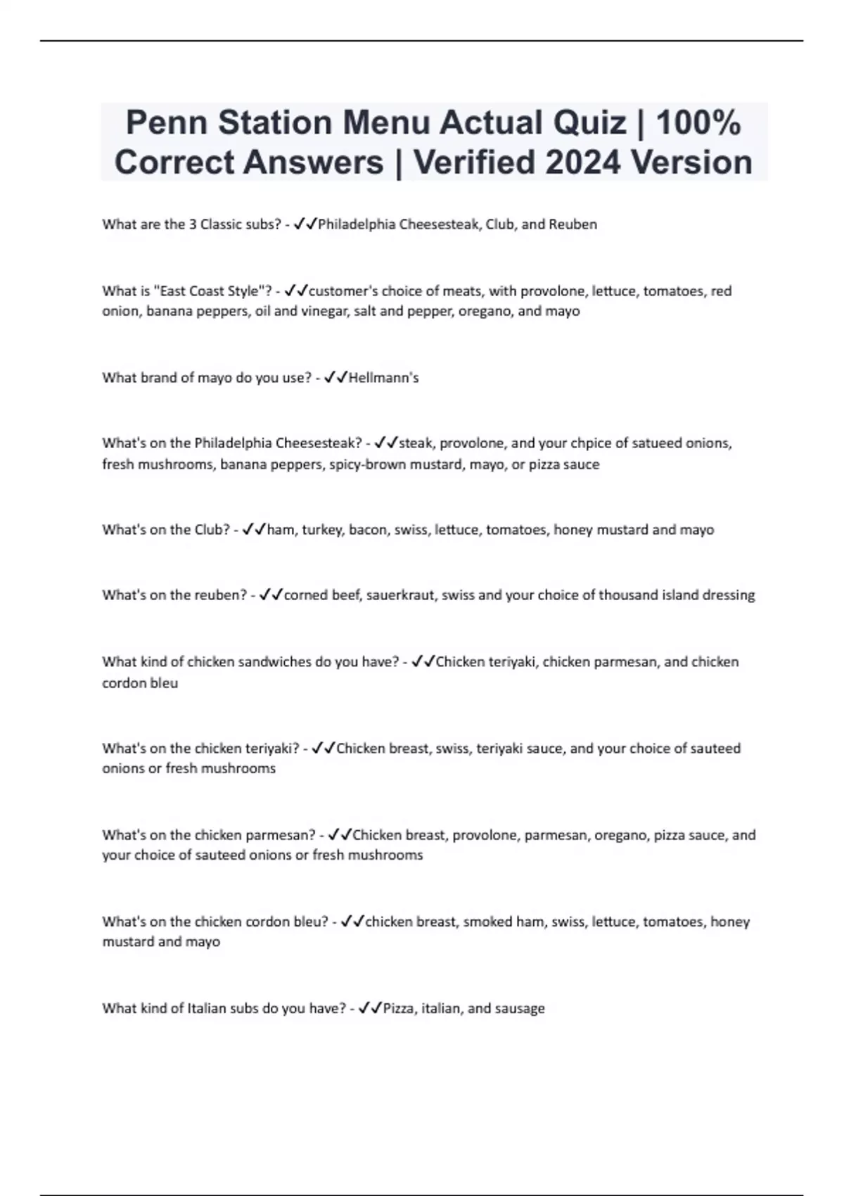 Penn Station Menu Actual Quiz | 100% Correct Answers | Verified 2024 Version