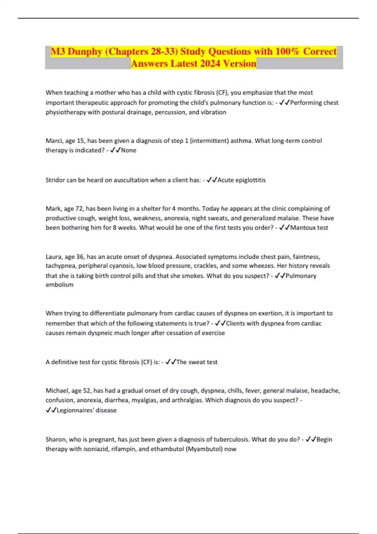 M3 Dunphy (Chapters 28-33) Study Questions with 100% Correct Answers Latest 2024 Version When teaching a mother who has a child with cystic fibrosis (CF), you emphasize that the most important therapeutic approach for promoting the child's pulmonary function is: - Performing chest physiotherapy with postural drainage, percussion, and vibration Marci, age 15, has been given a diagnosis of step 1 (intermittent) asthma. What long-term control therapy is indicated? - None Stridor can be heard on auscultation when a client has: - Acute epiglottitis Mark, age 72, has been living in a shelter for 4 months. Today he appears at the clinic complaining of productive cough, weight loss, weakness, anorexia, night sweats, and generalized malaise. These have been bothering him for 8 weeks. What would be one of the first tests you order? - Mantoux test Laura, age 36, has an acute onset of dyspnea. Associated symptoms include chest pain, faintness, tachypnea, peripheral cyanosis, low blood pressure, crackles, and some wheezes. Her history reveals that she is taking birth control pills and that she smokes. What do you suspect? - Pulmonary embolism