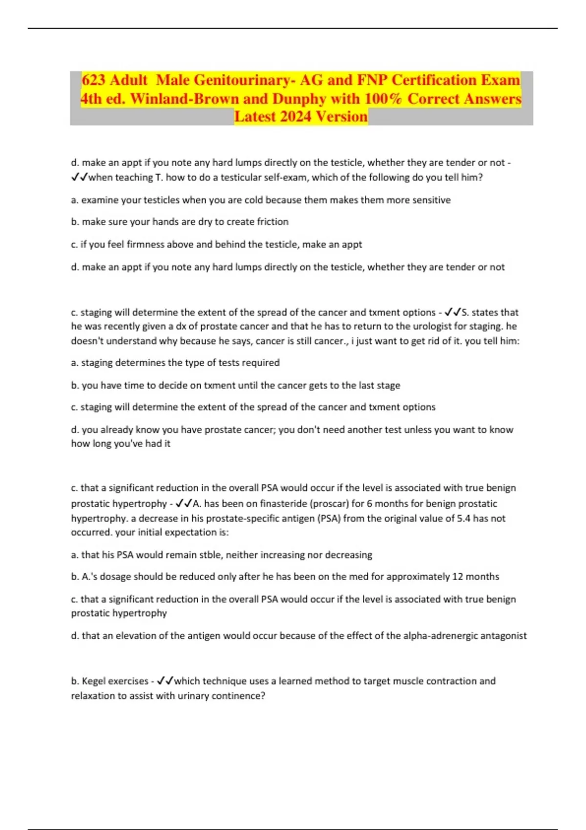 623 Adult Male Genitourinary- AG and FNP Certification Exam 4th ed. Winland-Brown and Dunphy with 100% Correct Answers Latest 2024 Version d. make an appt if you note any hard lumps directly on the testicle, whether they are tender or not - when teaching T. how to do a testicular self-exam, which of the following do you tell him? a. examine your testicles when you are cold because them makes them more sensitive b. make sure your hands are dry to create friction c. if you feel firmness above and behind the testicle, make an appt d. make an appt if you note any hard lumps directly on the testicle, whether they are tender or not c. staging will determine the extent of the spread of the cancer and txment options - S. states that he was recently given a dx of prostate cancer and that he has to return to the urologist for staging. he doesn't understand why because he says, cancer is still cancer., i just want to get rid of it. you tell him: a. staging determines the type of tests required b. you have time to decide on txment until the cancer gets to the last stage c. staging will determine the extent of the spread of the cancer and txment options d. you already know you have prostate cancer; you don't need another test unless you want to know how long you've had it c. that a significant reduction in the overall PSA would occur if the level is associated with true benign prostatic hypertrophy - A. has been on finasteride (proscar) for 6 months for benign prostatic hypertrophy. a decrease in his prostate-specific antigen (PSA) from the original value of 5.4 has not occurred. your initial expectation is: a. that his PSA would remain stble, neither increasing nor decreasing