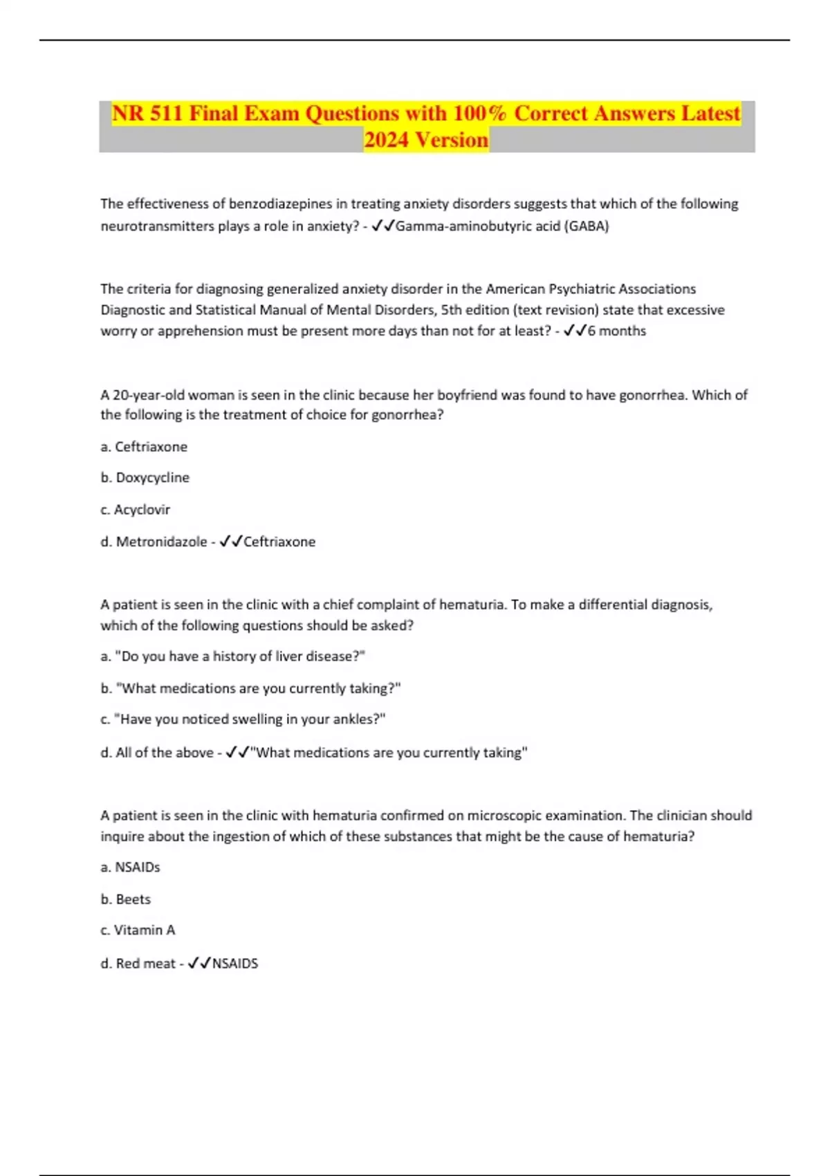 NR 511 Final Exam Questions with 100% Correct Answers Latest 2024 Version The effectiveness of benzodiazepines in treating anxiety disorders suggests that which of the following neurotransmitters plays a role in anxiety? - Gamma-aminobutyric acid (GABA) The criteria for diagnosing generalized anxiety disorder in the American Psychiatric Associations Diagnostic and Statistical Manual of Mental Disorders, 5th edition (text revision) state that excessive worry or apprehension must be present more days than not for at least? - 6 months A 20-year-old woman is seen in the clinic because her boyfriend was found to have gonorrhea. Which of the following is the treatment of choice for gonorrhea? a. Ceftriaxone b. Doxycycline c. Acyclovir d. Metronidazole - Ceftriaxone A patient is seen in the clinic with a chief complaint of hematuria. To make a differential diagnosis, which of the following questions should be asked? a. "Do you have a history of liver disease?" b. "What medications are you currently taking?" c. "Have you noticed swelling in your ankles?" d. All of the above - "What medications are you currently taking
