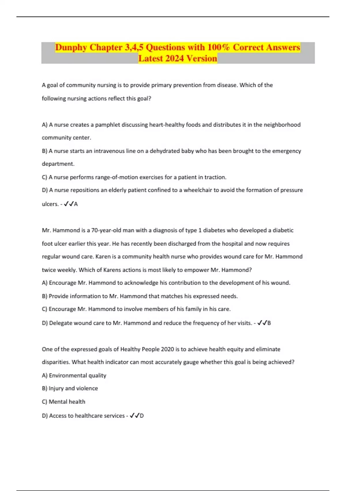 Dunphy Chapter 3,4,5 Questions with 100% Correct Answers Latest 2024 Version A goal of community nursing is to provide primary prevention from disease. Which of the following nursing actions reflect this goal? A) A nurse creates a pamphlet discussing heart-healthy foods and distributes it in the neighborhood community center. B) A nurse starts an intravenous line on a dehydrated baby who has been brought to the emergency department. C) A nurse performs range-of-motion exercises for a patient in traction. D) A nurse repositions an elderly patient confined to a wheelchair to avoid the formation of pressure ulcers. - A Mr. Hammond is a 70-year-old man with a diagnosis of type 1 diabetes who developed a diabetic foot ulcer earlier this year. He has recently been discharged from the hospital and now requires regular wound care. Karen is a community health nurse who provides wound care for Mr. Hammond twice weekly. Which of Karens actions is most likely to empower Mr. Hammond? A) Encourage Mr. Hammond to acknowledge his contribution to the development of his wound. B) Provide information to Mr. Hammond that matches his expressed needs. C) Encourage Mr. Hammond to involve members of his family in his care. D) Delegate wound care to Mr. Hammond and reduce the frequency of her visits. - B