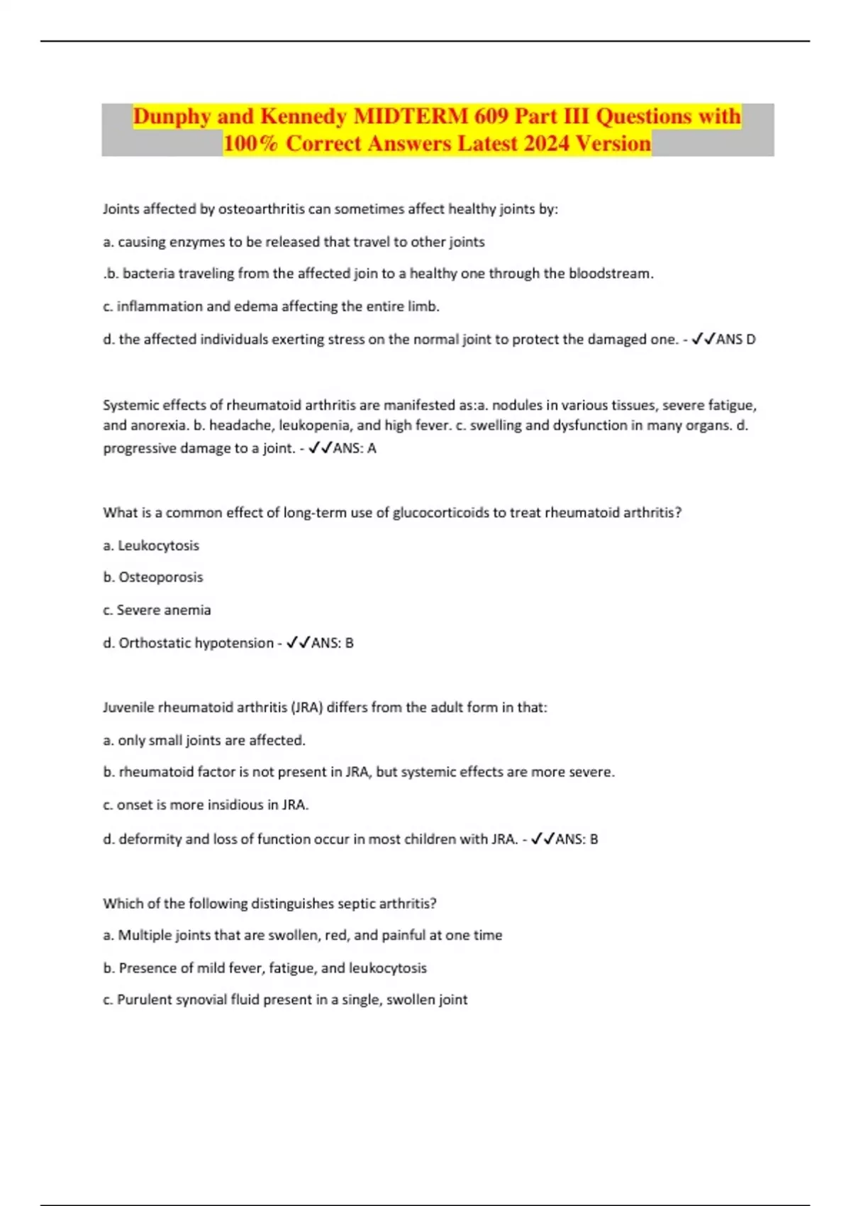 Dunphy and Kennedy MIDTERM 609 Part III Questions with 100% Correct Answers Latest 2024 Version Joints affected by osteoarthritis can sometimes affect healthy joints by: a. causing enzymes to be released that travel to other joints .b. bacteria traveling from the affected join to a healthy one through the bloodstream. c. inflammation and edema affecting the entire limb. d. the affected individuals exerting stress on the normal joint to protect the damaged one. - ANS D Systemic effects of rheumatoid arthritis are manifested as:a. nodules in various tissues, severe fatigue, and anorexia. b. headache, leukopenia, and high fever. c. swelling and dysfunction in many organs. d. progressive damage to a joint. - ANS: A What is a common effect of long-term use of glucocorticoids to treat rheumatoid arthritis? a. Leukocytosis b. Osteoporosis c. Severe anemia d. Orthostatic hypotension - ANS: B Juvenile rheumatoid arthritis (JRA) differs from the adult form in that: a. only small joints are affected. b. rheumatoid factor is not present in JRA, but systemic effects are more severe. c. onset is more insidious in JRA. d. deformity and loss of function occur in most children with JRA. - ANS: B