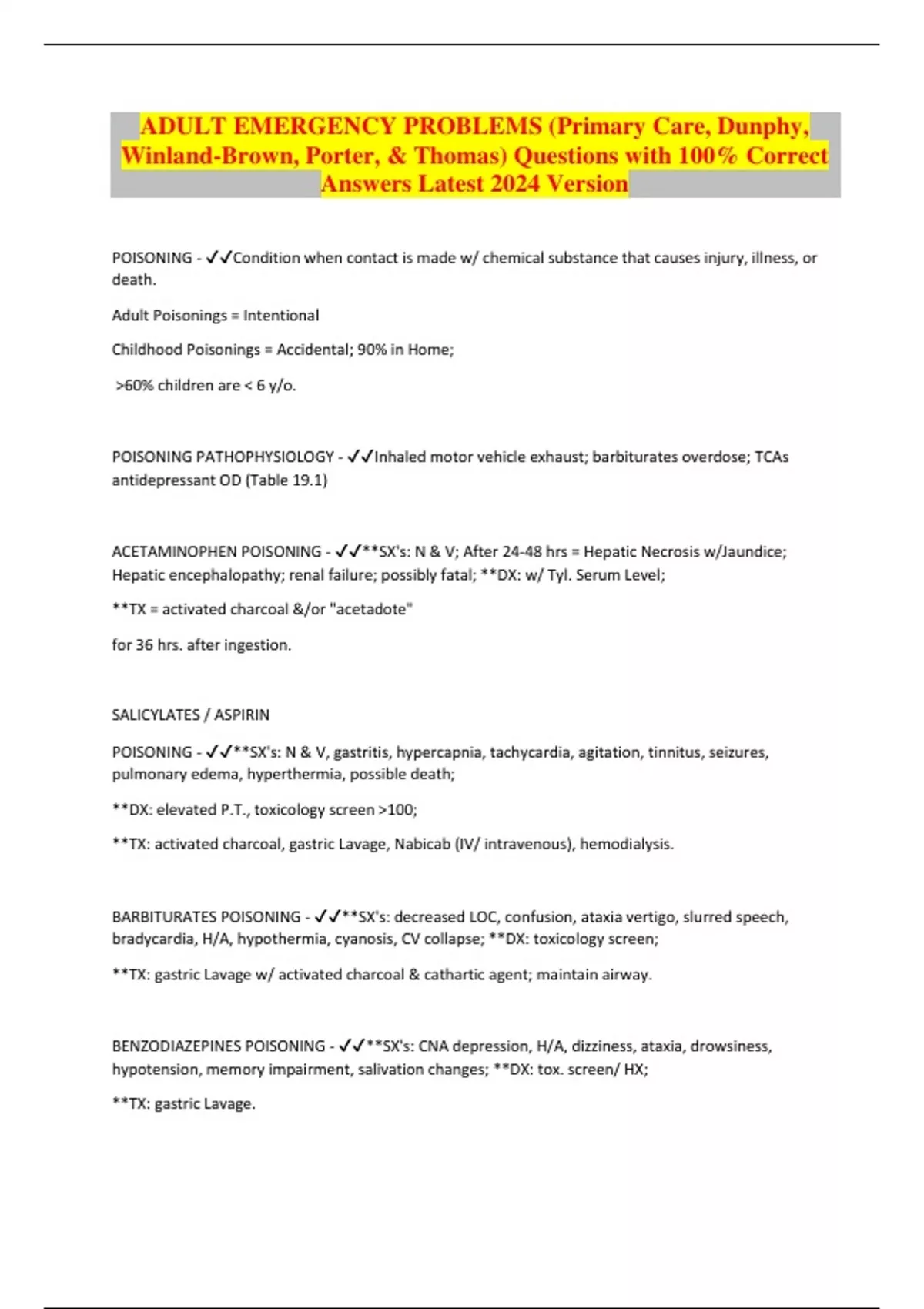 ADULT EMERGENCY PROBLEMS (Primary Care, Dunphy, Winland-Brown, Porter, & Thomas) Questions with 100% Correct Answers Latest 2024 Version POISONING - Condition when contact is made w/ chemical substance that causes injury, illness, or death. Adult Poisonings = Intentional Childhood Poisonings = Accidental; 90% in Home; >60% children are < 6 y/o. POISONING PATHOPHYSIOLOGY - Inhaled motor vehicle exhaust; barbiturates overdose; TCAs antidepressant OD (Table 19.1) ACETAMINOPHEN POISONING - **SX's: N & V; After 24-48 hrs = Hepatic Necrosis w/Jaundice; Hepatic encephalopathy; renal failure; possibly fatal; **DX: w/ Tyl. Serum Level; **TX = activated charcoal &/or "acetadote" for 36 hrs. after ingestion. SALICYLATES / ASPIRIN POISONING - **SX's: N & V, gastritis, hypercapnia, tachycardia, agitation, tinnitus, seizures, pulmonary edema, hyperthermia, possible death; **DX: elevated P.T., toxicology screen >100; **TX: activated charcoal, gastric Lavage, Nabicab (IV/ intravenous), hemodialysis.