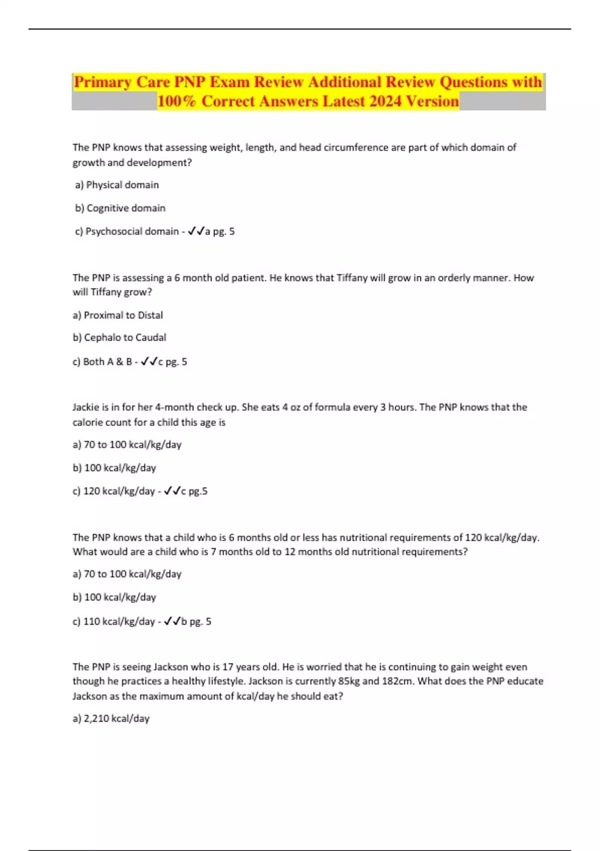 Primary Care PNP Exam Review Additional Review Questions with 100% Correct Answers Latest 2024 Version The PNP knows that assessing weight, length, and head circumference are part of which domain of growth and development? a) Physical domain b) Cognitive domain c) Psychosocial domain - a pg. 5 The PNP is assessing a 6 month old patient. He knows that Tiffany will grow in an orderly manner. How will Tiffany grow? a) Proximal to Distal b) Cephalo to Caudal c) Both A & B - c pg. 5 Jackie is in for her 4-month check up. She eats 4 oz of formula every 3 hours. The PNP knows that the calorie count for a child this age is a) 70 to 100 kcal/kg/day b) 100 kcal/kg/day c) 120 kcal/kg/day - c pg.5 The PNP knows that a child who is 6 months old or less has nutritional requirements of 120 kcal/kg/day. What would are a child who is 7 months old to 12 months old nutritional requirements? a) 70 to 100 kcal/kg/day b) 100 kcal/kg/day c) 110 kcal/kg/day - b pg. 5