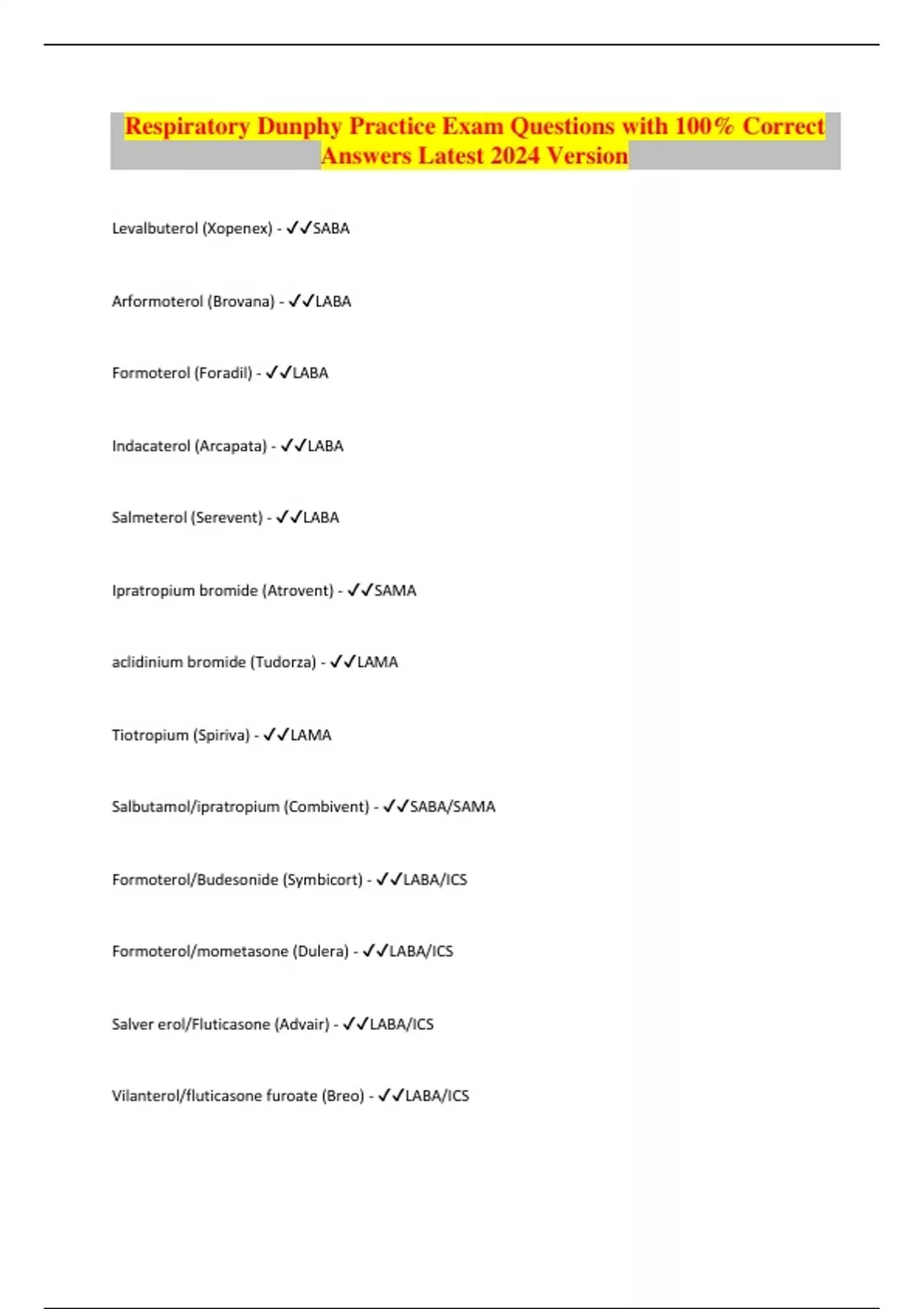 Respiratory Dunphy Practice Exam Questions with 100% Correct Answers Latest 2024 Version Levalbuterol (Xopenex) - SABA Arformoterol (Brovana) - LABA Formoterol (Foradil) - LABA Indacaterol (Arcapata) - LABA Salmeterol (Serevent) - LABA Ipratropium bromide (Atrovent) - SAMA aclidinium bromide (Tudorza) - LAMA Tiotropium (Spiriva) - LAMA Salbutamol/ipratropium (Combivent) - SABA/SAMA Formoterol/Budesonide (Symbicort) - LABA/ICS Formoterol/mometasone (Dulera) - LABA/ICS Salver erol/Fluticasone (Advair) - LABA/ICS Vilanterol/fluticasone furoate (Breo) - LABA/ICS