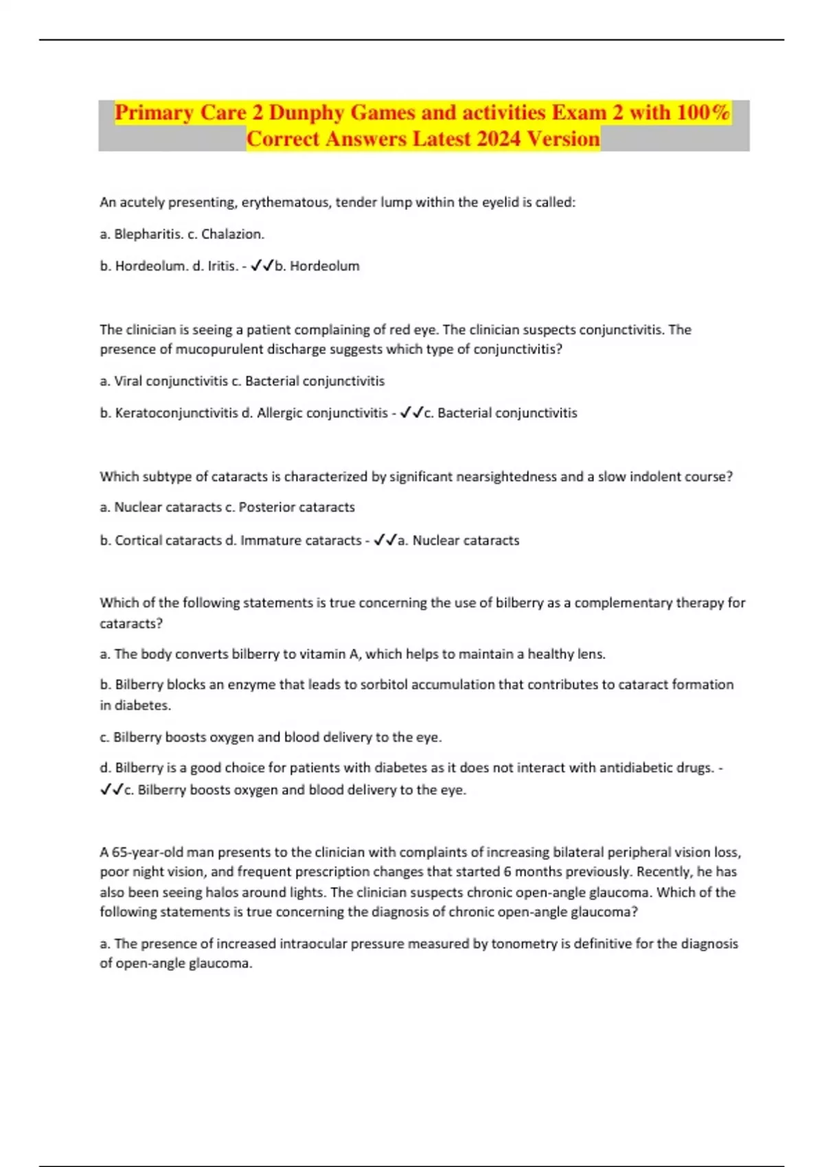 Primary Care 2 Dunphy Games and activities Exam 2 with 100% Correct Answers Latest 2024 Version An acutely presenting, erythematous, tender lump within the eyelid is called: a. Blepharitis. c. Chalazion. b. Hordeolum. d. Iritis. - b. Hordeolum The clinician is seeing a patient complaining of red eye. The clinician suspects conjunctivitis. The presence of mucopurulent discharge suggests which type of conjunctivitis? a. Viral conjunctivitis c. Bacterial conjunctivitis b. Keratoconjunctivitis d. Allergic conjunctivitis - c. Bacterial conjunctivitis Which subtype of cataracts is characterized by significant nearsightedness and a slow indolent course? a. Nuclear cataracts c. Posterior cataracts b. Cortical cataracts d. Immature cataracts - a. Nuclear cataracts Which of the following statements is true concerning the use of bilberry as a complementary therapy for cataracts? a. The body converts bilberry to vitamin A, which helps to maintain a healthy lens. b. Bilberry blocks an enzyme that leads to sorbitol accumulation that contributes to cataract formation in diabetes. c. Bilberry boosts oxygen and blood delivery to the eye. d. Bilberry is a good choice for patients with diabetes as it does not interact with antidiabetic drugs. - c. Bilberry boosts oxygen and blood delivery to the eye.