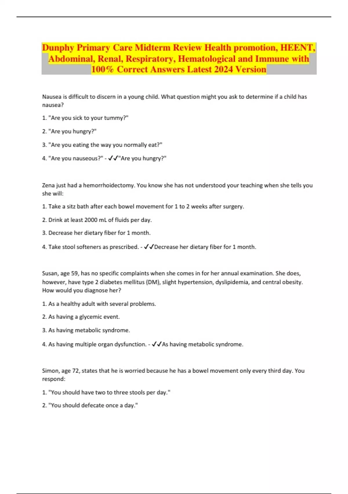 Dunphy Primary Care Midterm Review Health promotion, HEENT, Abdominal, Renal, Respiratory, Hematological and Immune with 100% Correct Answers Latest 2024 Version Nausea is difficult to discern in a young child. What question might you ask to determine if a child has nausea? 1. "Are you sick to your tummy?" 2. "Are you hungry?" 3. "Are you eating the way you normally eat?" 4. "Are you nauseous?" - "Are you hungry?" Zena just had a hemorrhoidectomy. You know she has not understood your teaching when she tells you she will: 1. Take a sitz bath after each bowel movement for 1 to 2 weeks after surgery. 2. Drink at least 2000 mL of fluids per day. 3. Decrease her dietary fiber for 1 month. 4. Take stool softeners as prescribed. - Decrease her dietary fiber for 1 month. Susan, age 59, has no specific complaints when she comes in for her annual examination. She does, however, have type 2 diabetes mellitus (DM), slight hypertension, dyslipidemia, and central obesity. How would you diagnose her? 1. As a healthy adult with several problems. 2. As having a glycemic event. 3. As having metabolic syndrome. 4. As having multiple organ dysfunction. - As having metabolic syndrome. Simon, age 72, states that he is worried because he has a bowel movement only every third day. You respond: 1. "You should have two to three stools per day." 2. "You should defecate once a day."