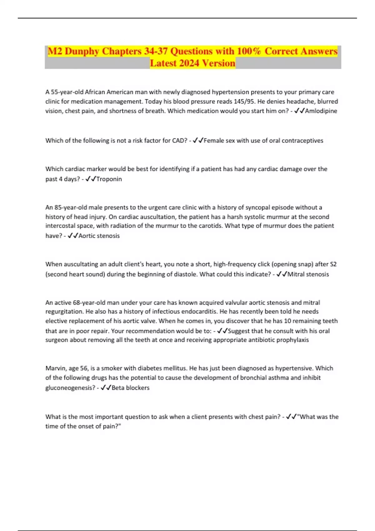 M2 Dunphy Chapters 34-37 Questions with 100% Correct Answers Latest 2024 Version A 55-year-old African American man with newly diagnosed hypertension presents to your primary care clinic for medication management. Today his blood pressure reads 145/95. He denies headache, blurred vision, chest pain, and shortness of breath. Which medication would you start him on? - Amlodipine Which of the following is not a risk factor for CAD? - Female sex with use of oral contraceptives Which cardiac marker would be best for identifying if a patient has had any cardiac damage over the past 4 days? - Troponin An 85-year-old male presents to the urgent care clinic with a history of syncopal episode without a history of head injury. On cardiac auscultation, the patient has a harsh systolic murmur at the second intercostal space, with radiation of the murmur to the carotids. What type of murmur does the patient have? - Aortic stenosis When auscultating an adult client's heart, you note a short, high-frequency click (opening snap) after S2 (second heart sound) during the beginning of diastole. What could this indicate? - Mitral stenosis An active 68-year-old man under your care has known acquired valvular aortic stenosis and mitral regurgitation. He also has a history of infectious endocarditis. He has recently been told he needs elective replacement of his aortic valve. When he comes in, you discover that he has 10 remaining teeth that are in poor repair. Your recommendation would be to: - Suggest that he consult with his oral surgeon about removing all the teeth at once and receiving appropriate antibiotic prophylaxis Marvin, age 56, is a smoker with diabetes mellitus. He has just been diagnosed as hypertensive. Which of the following drugs has the potential to cause the development of bronchial asthma and inhibit gluconeogenesis? - Beta blockers