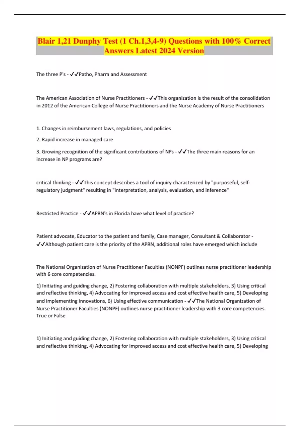 Blair 1,21 Dunphy Test (1 Ch.1,3,4-9) Questions with 100% Correct Answers Latest 2024 Version The three P's - Patho, Pharm and Assessment The American Association of Nurse Practitioners - This organization is the result of the consolidation in 2012 of the American College of Nurse Practitioners and the Nurse Academy of Nurse Practitioners 1. Changes in reimbursement laws, regulations, and policies 2. Rapid increase in managed care 3. Growing recognition of the significant contributions of NPs - The three main reasons for an increase in NP programs are? critical thinking - This concept describes a tool of inquiry characterized by "purposeful, self- regulatory judgment" resulting in "interpretation, analysis, evaluation, and inference" Restricted Practice - APRN's in Florida have what level of practice? Patient advocate, Educator to the patient and family, Case manager, Consultant & Collaborator - Although patient care is the priority of the APRN, additional roles have emerged which include The National Organization of Nurse Practitioner Faculties (NONPF) outlines nurse practitioner leadership with 6 core competencies. 1) Initiating and guiding change, 2) Fostering collaboration with multiple stakeholders, 3) Using critical and reflective thinking, 4) Advocating for improved access and cost effective health care, 5) Developing and implementing innovations, 6) Using effective communication - The National Organization of Nurse Practitioner Faculties (NONPF) outlines nurse practitioner leadership with 3 core competencies. True or False 1) Initiating and guiding change, 2) Fostering collaboration with multiple stakeholders, 3) Using critical and reflective thinking, 4) Advocating for improved access and cost effective health care, 5) Developing