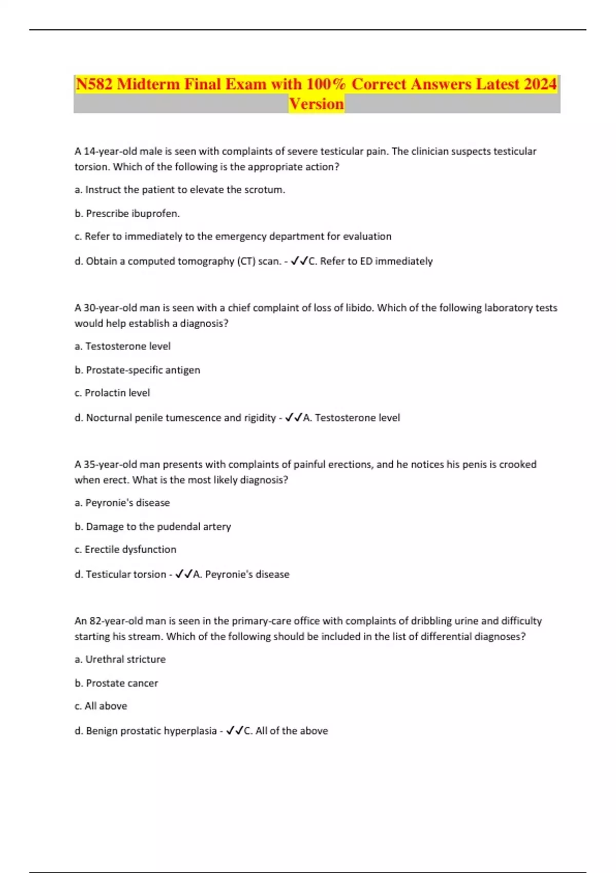 N582 Midterm Final Exam with 100% Correct Answers Latest 2024 Version A 14-year-old male is seen with complaints of severe testicular pain. The clinician suspects testicular torsion. Which of the following is the appropriate action? a. Instruct the patient to elevate the scrotum. b. Prescribe ibuprofen. c. Refer to immediately to the emergency department for evaluation d. Obtain a computed tomography (CT) scan. - C. Refer to ED immediately A 30-year-old man is seen with a chief complaint of loss of libido. Which of the following laboratory tests would help establish a diagnosis? a. Testosterone level b. Prostate-specific antigen c. Prolactin level d. Nocturnal penile tumescence and rigidity - A. Testosterone level A 35-year-old man presents with complaints of painful erections, and he notices his penis is crooked when erect. What is the most likely diagnosis? a. Peyronie's disease b. Damage to the pudendal artery c. Erectile dysfunction d. Testicular torsion - A. Peyronie's disease An 82-year-old man is seen in the primary-care office with complaints of dribbling urine and difficulty starting his stream. Which of the following should be included in the list of differential diagnoses? a. Urethral stricture b. Prostate cancer c. All above d. Benign prostatic hyperplasia - C. All of the above