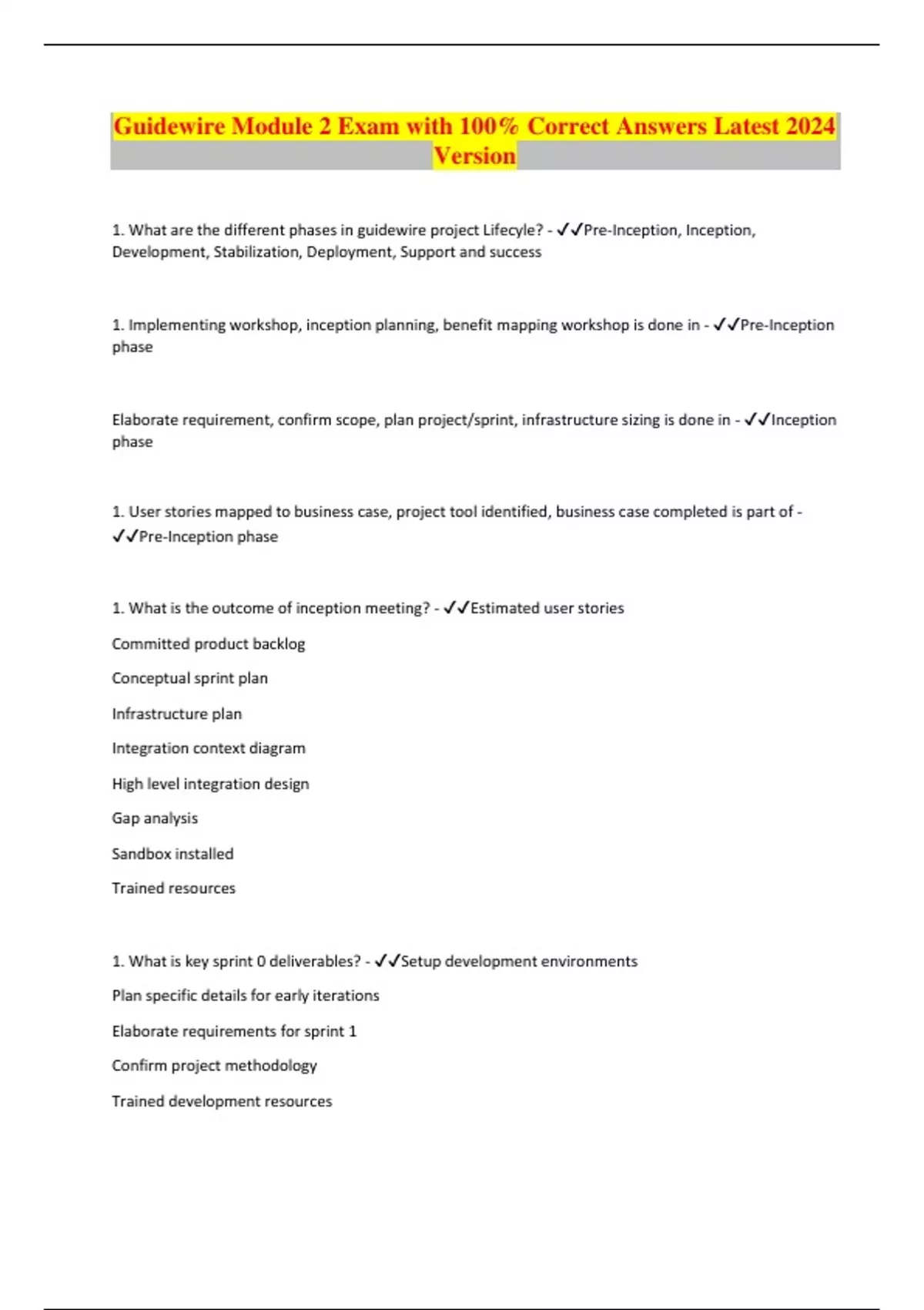 Guidewire Module 2 Exam with 100% Correct Answers Latest 2024 Version 1. What are the different phases in guidewire project Lifecyle? - Pre-Inception, Inception, Development, Stabilization, Deployment, Support and success 1. Implementing workshop, inception planning, benefit mapping workshop is done in - Pre-Inception phase Elaborate requirement, confirm scope, plan project/sprint, infrastructure sizing is done in - Inception phase 1. User stories mapped to business case, project tool identified, business case completed is part of - Pre-Inception phase 1. What is the outcome of inception meeting? - Estimated user stories Committed product backlog Conceptual sprint plan Infrastructure plan Integration context diagram High level integration design Gap analysis Sandbox installed Trained resources