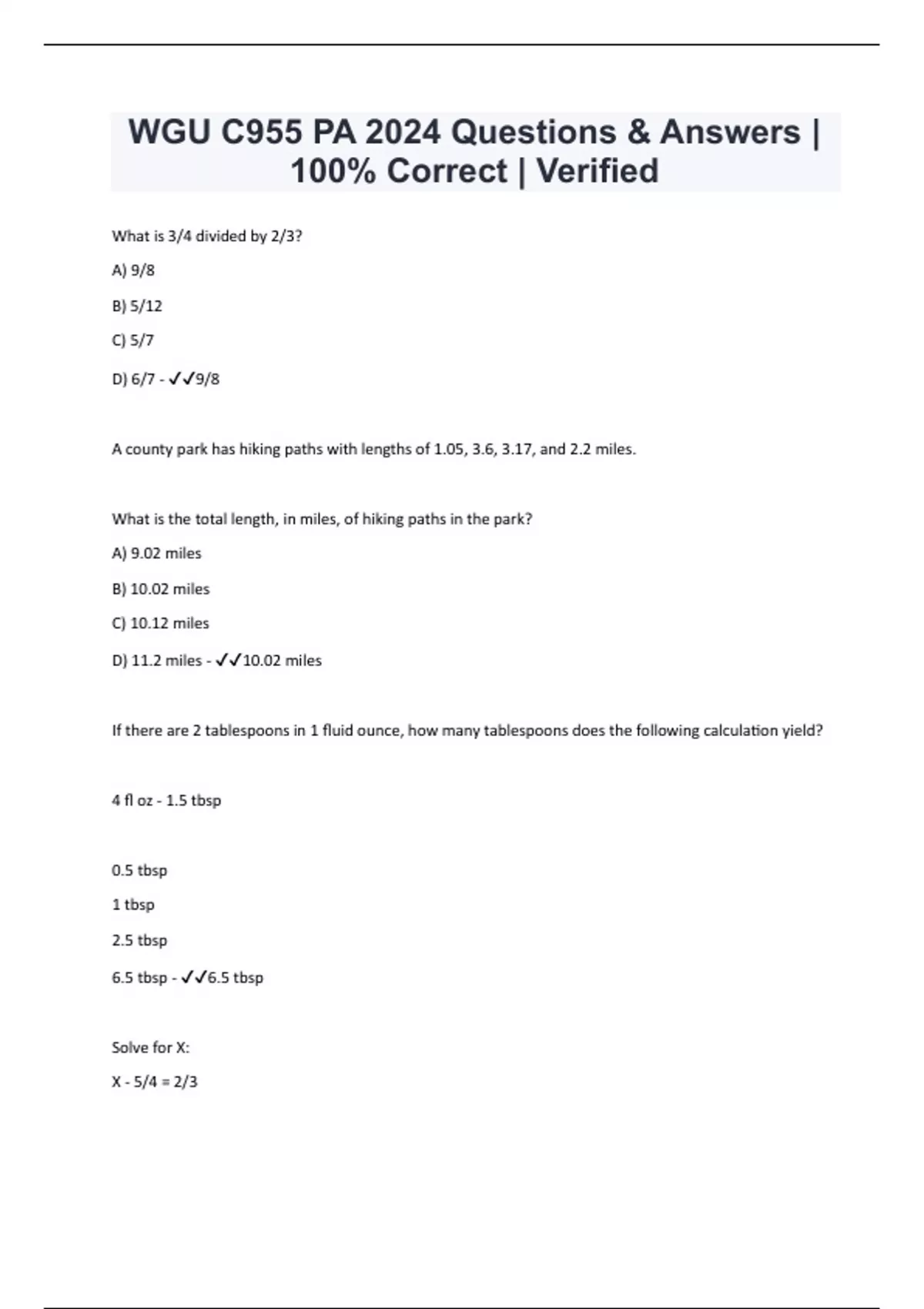 What is 3/4 divided by 2/3? A) 9/8 B) 5/12 C) 5/7 D) 6/7 - 9/8 A county park has hiking paths with lengths of 1.05, 3.6, 3.17, and 2.2 miles. What is the total length, in miles, of hiking paths in the park? A) 9.02 miles B) 10.02 miles C) 10.12 miles D) 11.2 miles - 10.02 miles If there are 2 tablespoons in 1 fluid ounce, how many tablespoons does the following calculation yield? 4 fl oz - 1.5 tbsp 0.5 tbsp 1 tbsp 2.5 tbsp 6.5 tbsp - 6.5 tbsp Solve for X: X - 5/4 = 2/3