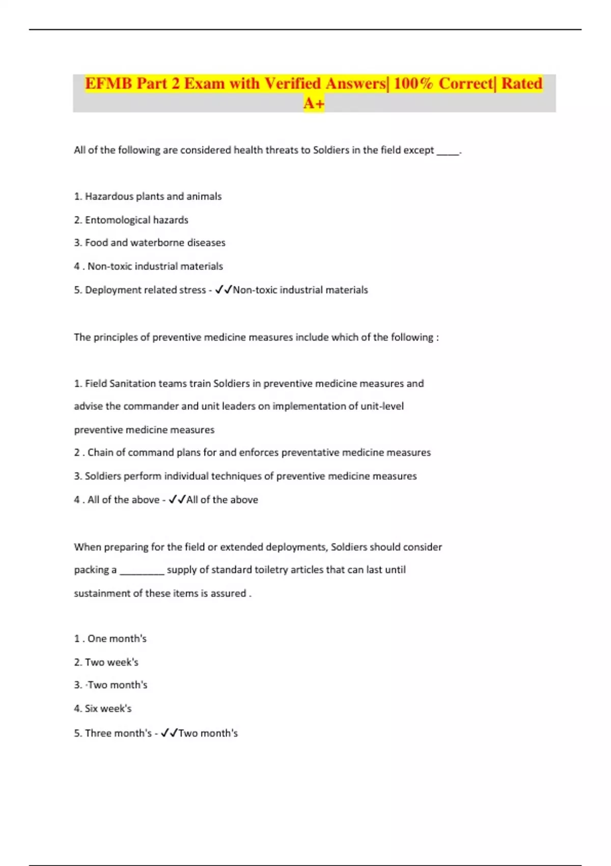 EFMB Part 2 Exam with Verified Answers| 100% Correct| Rated A+ All of the following are considered health threats to Soldiers in the field except ____. 1. Hazardous plants and animals 2. Entomological hazards 3. Food and waterborne diseases 4 . Non-toxic industrial materials 5. Deployment related stress - Non-toxic industrial materials The principles of preventive medicine measures include which of the following : 1. Field Sanitation teams train Soldiers in preventive medicine measures and advise the commander and unit leaders on implementation of unit-level preventive medicine measures 2 . Chain of command plans for and enforces preventative medicine measures 3. Soldiers perform individual techniques of preventive medicine measures 4 . All of the above - All of the above