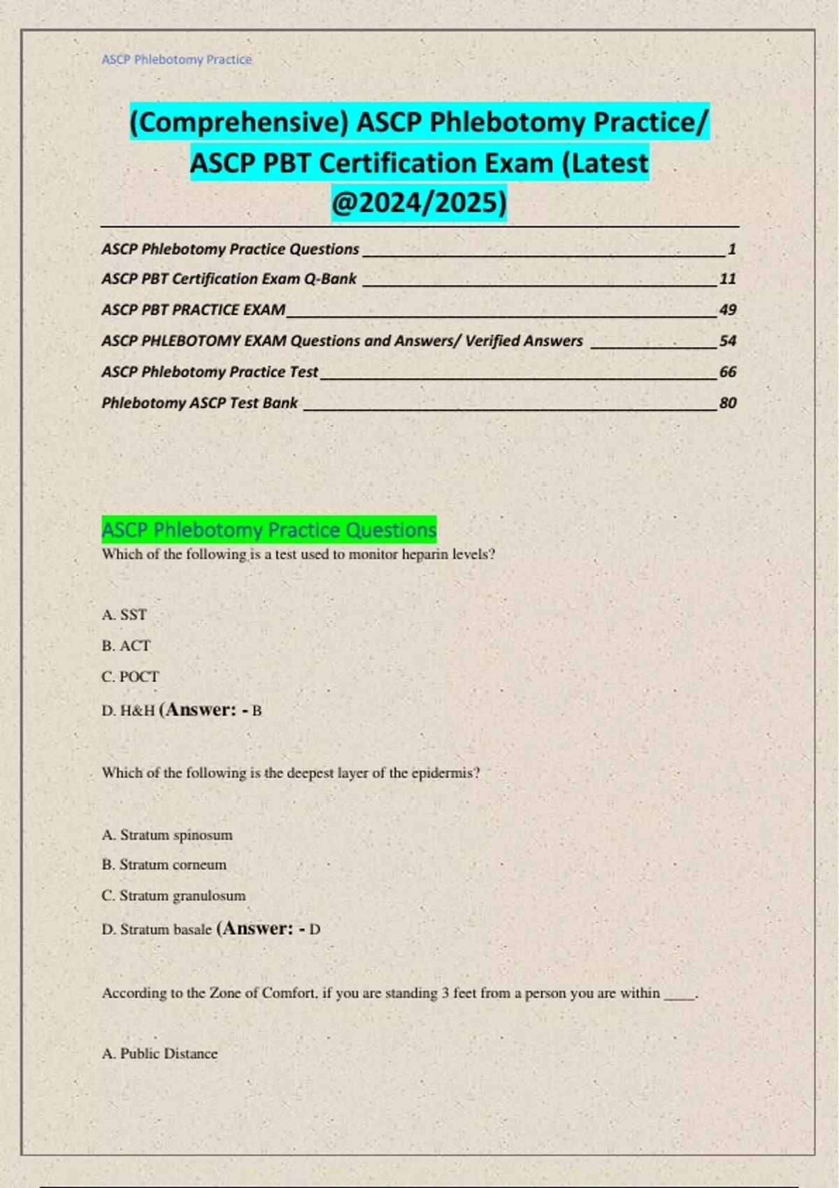 (Comprehensive) ASCP Phlebotomy Practice/ ASCP PBT Certification Exam (Latest @2024/2025),(Comprehensive) ASCP Phlebotomy Practice/ ASCP PBT Certification Exam (Latest @2024/2025)