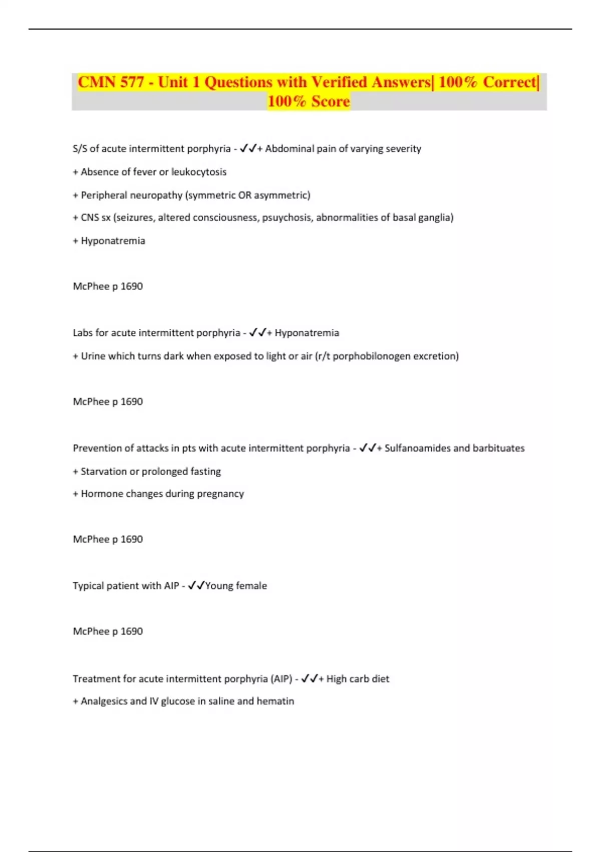 CMN 577 - Unit 1 Questions with Verified Answers| 100% Correct| 100% Score S/S of acute intermittent porphyria - + Abdominal pain of varying severity + Absence of fever or leukocytosis + Peripheral neuropathy (symmetric OR asymmetric) + CNS sx (seizures, altered consciousness, psuychosis, abnormalities of basal ganglia) + Hyponatremia McPhee p 1690 Labs for acute intermittent porphyria - + Hyponatremia + Urine which turns dark when exposed to light or air (r/t porphobilonogen excretion) McPhee p 1690 Prevention of attacks in pts with acute intermittent porphyria - + Sulfanoamides and barbituates + Starvation or prolonged fasting + Hormone changes during pregnancy McPhee p 1690 Typical patient with AIP - Young female McPhee p 1690