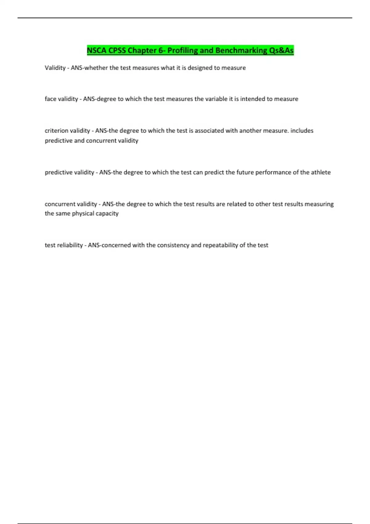 NSCA CPSS Chapter 6- Profiling and Benchmarking Qs&As Validity - ANS-whether the test measures what it is designed to measure face validity - ANS-degree to which the test measures the variable it is intended to measure criterion validity - ANS-the degree to which the test is associated with another measure. includes predictive and concurrent validity predictive validity - ANS-the degree to which the test can predict the future performance of the athlete concurrent validity - ANS-the degree to which the test results are related to other test results measuring the same physical capacity test reliability - ANS
