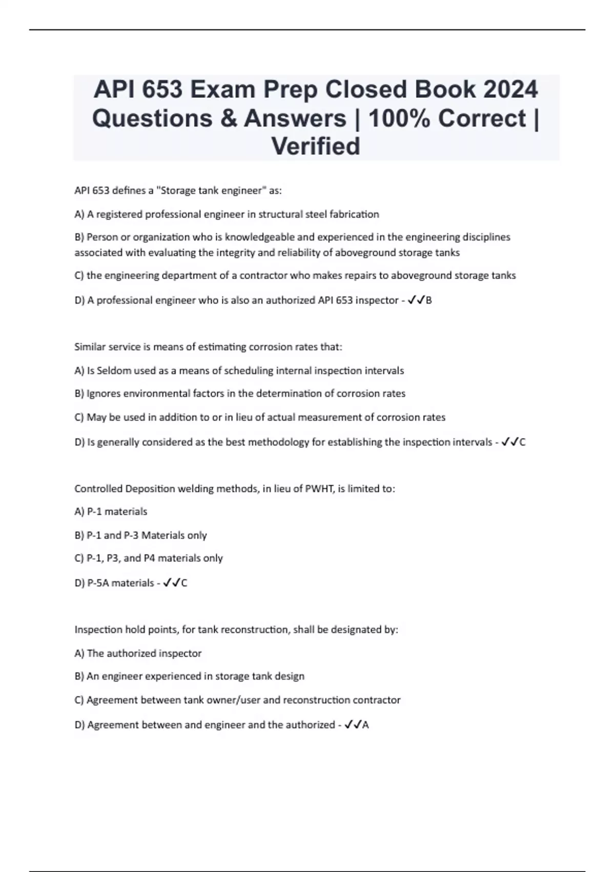 API 653 Exam Prep Closed Book 2024 Questions & Answers | 100% Correct | Verified