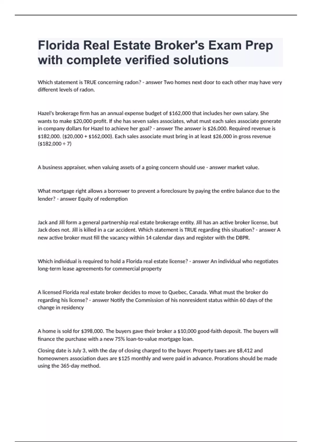 Florida Real Estate Broker's Exam Prep with complete verified solutions.