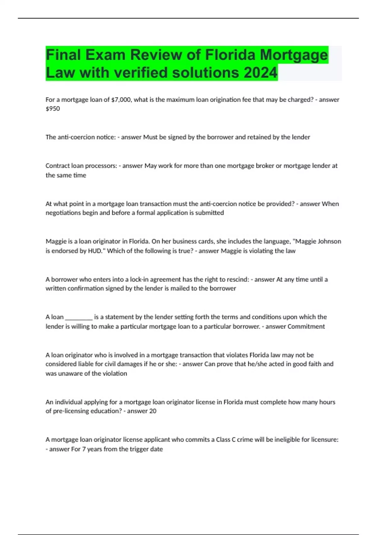 Final Exam Review of Florida Mortgage Law with verified solutions 2024.