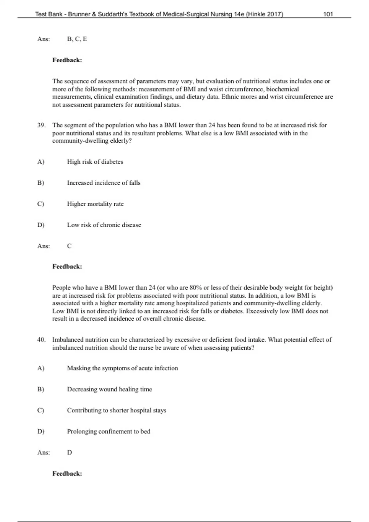 39. The segment of the population who has a BMI lower than 24 has been found to be at increased risk for poor nutritional status and its resultant problems. What else is a low BMI associated with in the community-dwelling elderly? A) High risk of diabetes B) Increased incidence of falls C) Higher mortality rate D) Low risk of chronic disease Ans: C Feedback: People who have a BMI lower than 24 (or who are 80% or less of their desirable body weight for height) are at increased risk for problems associated with poor nutritional status. In addition, a low BMI is associated with a higher mortality rate among hospitalized patients and community-dwelling elderly. Low BMI is not directly linked to an increased risk for falls or diabetes. Excessively low BMI does not result in a decreased incidence of overall chronic disease. 40. Imbalanced nutrition can be characterized by excessive or deficient food intake. What potential effect of imbalanced nutrition should the nurse be aware of when assessing patients? A) Masking the symptoms of acute infection B) Decreasing wound healing time C) Contributing to shorter hospital stays D) Prolonging confinement to bed Ans: D Feedback: Test Bank - Brunner & Suddarth's Textbook of Medical-Surgical Nursing 14e (Hinkle 2017) 10