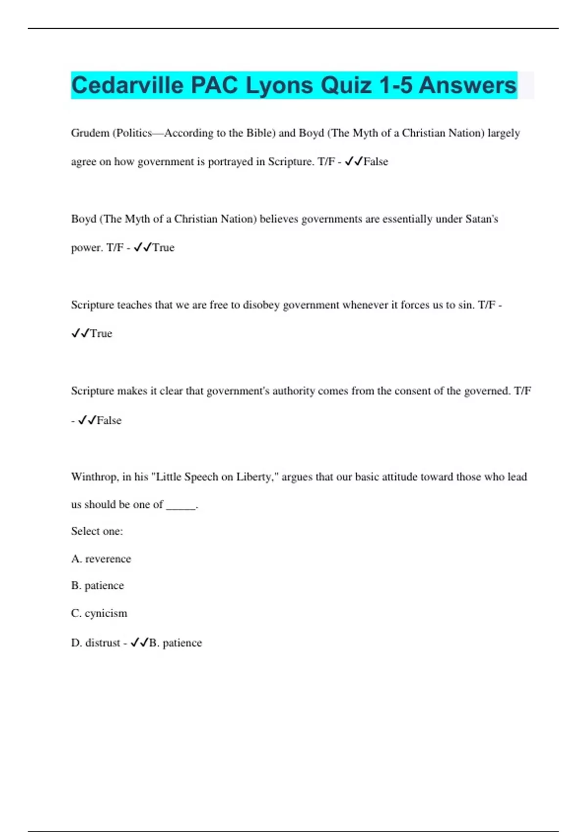 Cedarville PAC Lyons Quiz 1-5 Answers Grudem (Politics—According to the Bible) and Boyd (The Myth of a Christian Nation) largely agree on how government is portrayed in Scripture. T/F - False Boyd (The Myth of a Christian Nation) believes governments are essentially under Satan's power. T/F - True Scripture teaches that we are free to disobey government whenever it forces us to sin. T/F - True Scripture makes it clear that government's authority comes from the consent of the governed. T/F - False Winthrop, in his "Little Speech on Liberty," argues that our basic attitude toward those who lead us should be one of _____. Select one: A. reverence B. patience C. cynicism D. distrust - B. patience Winthrop's "Little Speech on Liberty" stresses that those who serve in elected positions are fundamentally unlike those they represent. T/F - False In his "Little Speech on Liberty," John Winthrop argues that civil liberty is the natural ability to do whatever we wish and only rarely should government be able to limit this kind of liberty. T/F - False According to Scripture, Christians are required to obey government unless government forces us to sin. T/F - True Both Jefferson and Locke think popular consent is a fundamental aspect of good government. - True Locke believes that citizens give up no rights or powers when they enter into a governmental structure. T/F - False Boucher ("On Civil Liberty...") thinks a government seeking the public good must be based on the consent of the governed. T/F - False Jefferson argues in the Declaration that citizens have the right to alter or abolish government when it fails to protect rights and liberties. T/F - True The document explaining the ideas of the Constitution and urging its ratification is the... Select one: A. Mayflower Compact. B. Federalist Papers. C. Anti-Federalist Papers. D. Declaration of Independence. E. Declaration of Conscience. - B. Federalist Papers. In Federalist No. 10, James Madison argued for what idea? Select one: A. America was not diverse enough to prevent powerful interest groups from exercising too much political power. B. Government is most dangerous when a single group is powerful enough to gain full political control. C. Interest groups should be heavily regulated in America. D. Monarchies are preferable to democracies. - B. Government is most dangerous when a single group is powerful enough to gain full political control. The principle of checks and balances, as discussed in Federalist #51, is based on the notion that... Select one: A. leaders are the trustees of the people. B. legislators and executives cannot be trusted, but judges are trustworthy. C. power and ambition must be used to offset power and ambition. D. a weak government is always preferable to a strong government. E. all legislative and executive action should be controlled through judicial power. - C. power and ambition must be used to offset power and ambition. In Federalist 10, Madison argues that a successful government will heavily regulate people to limit their freedom to form groups. T/F - False In Federalist 51, Madison suggests that human beings are "good" enough to be trusted with significant political power. T/F - False Montezuma, in his satirical