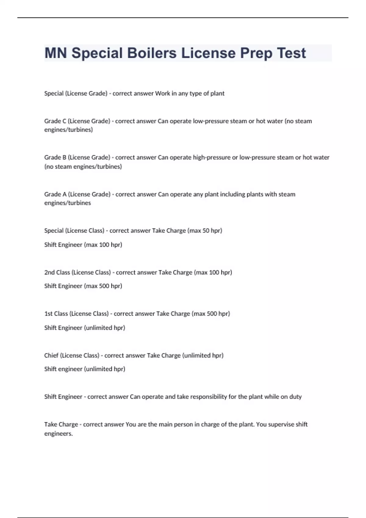 MN Special Boilers License Prep Test With Correct Answers 2024. Special (License Grade) - correct answer Work in any type of plant Grade C (License Grade) - correct answer Can operate low-pressure steam or hot water (no steam engines/turbines) Grade B (License Grade) - correct answer Can operate high-pressure or low-pressure steam or hot water (no steam engines/turbines) Grade A (License Grade) - correct answer Can operate any plant including plants with steam engines/turbines Special (License Class) - correct answer Take Charge (max 50 hpr) Shift Engineer (max 100 hpr) 2nd Class (License Class) - correct answer Take Charge (max 100 hpr) Shift Engineer (max 500 hpr) 1st Class (License Class) - correct answer Take Charge (max 500 hpr) Shift Engineer (unlimited hpr) Chief (License Class) - correct answer Take Charge (unlimited hpr) Shift engineer (unlimited hpr) Shift Engineer - correct answer Can operate and take responsibility for the plant while on duty Take Charge - correct answer You are the main person in charge of the plant. You supervise shift engineers.