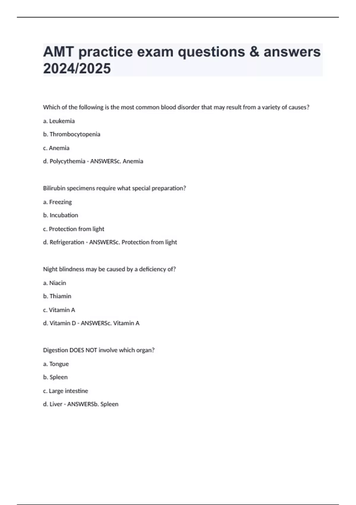 AMT practice exam questions & answers 2024/2025 Which of the following is the most common blood disorder that may result from a variety of causes? a. Leukemia b. Thrombocytopenia c. Anemia d. Polycythemia - ANSWERSc. Anemia Bilirubin specimens require what special preparation? a. Freezing b. Incubation c. Protection from light d. Refrigeration - ANSWERSc. Protection from light Night blindness may be caused by a deficiency of? a. Niacin b. Thiamin c. Vitamin A d. Vitamin D - ANSWERSc. Vitamin A Digestion DOES NOT involve which organ? a. Tongue b. Spleen c. Large intestine d. Liver - ANSWERSb. Spleen