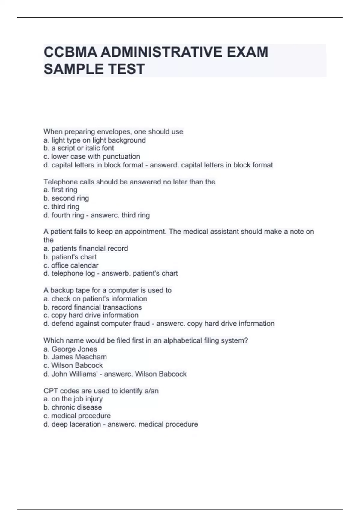 CCBMA ADMINISTRATIVE EXAM SAMPLE TEST
