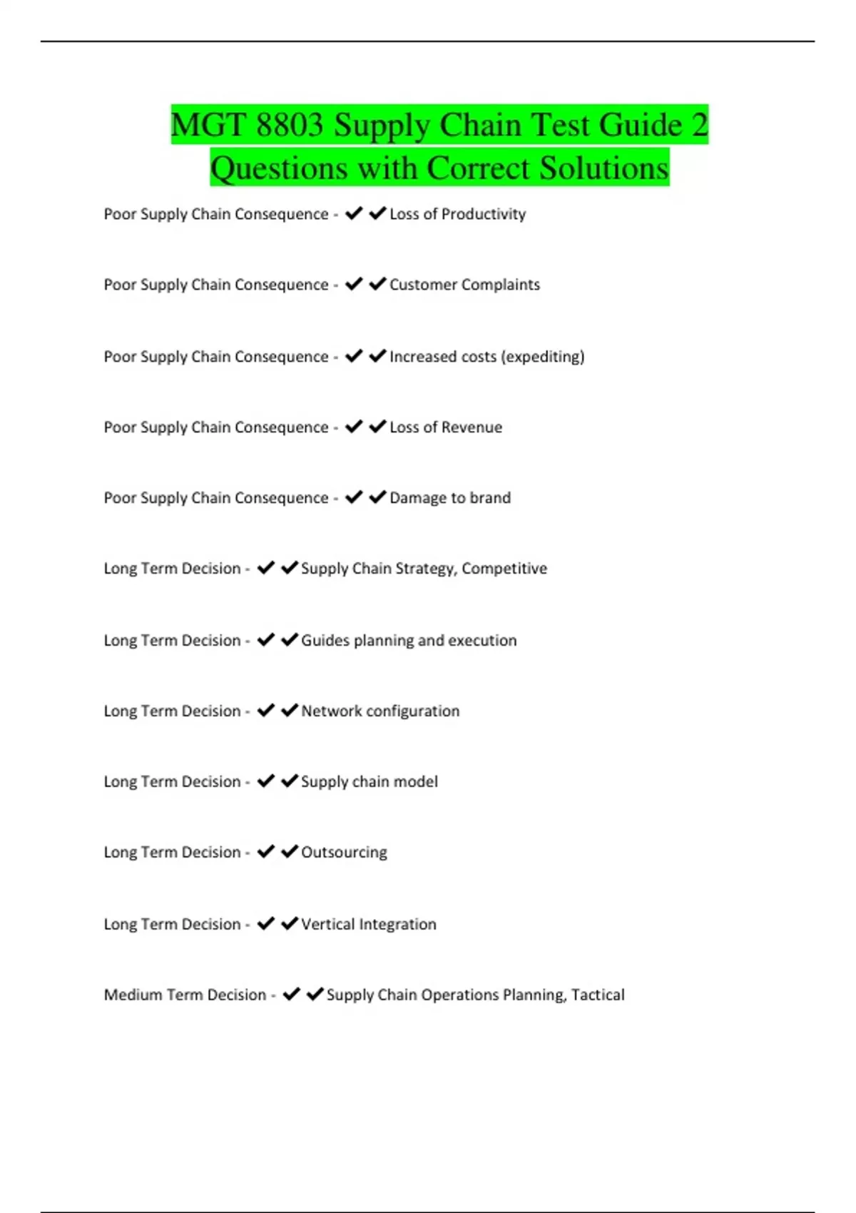MGT 8803 Supply Chain Test Guide 2 Questions with Correct Solutions
