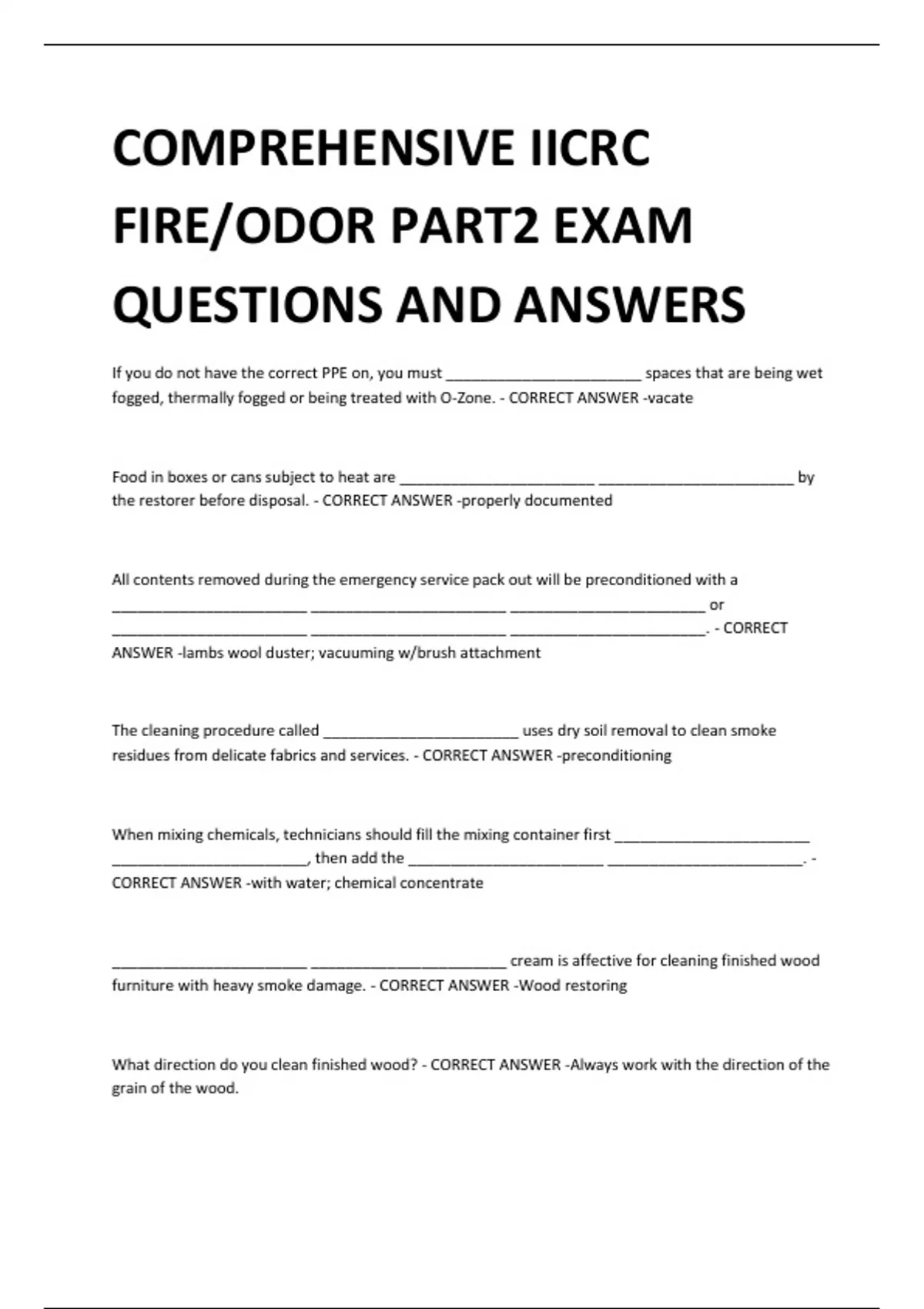 COMPREHENSIVE IICRC FIRE/ODOR PART2 EXAM QUESTIONS AND ANSWERS If you do not have the correct PPE on, you must _______________________ spaces that are being wet fogged, thermally fogged or being treated with O-Zone. - CORRECT ANSWER -vacate Food in boxes or cans subject to heat are _______________________ _______________________ by the restorer before disposal. - CORRECT ANSWER -properly documented All contents removed during the emergency service pack out will be preconditioned with a _______________________ _______________________ _______________________ or _______________________ _______________________ _______________________. - CORRECT ANSWER -lambs wool duster; vacuuming w/brush attachment The cleaning procedure called _______________________ uses dry soil removal to clean smoke residues from delicate fabrics and services. - CORRECT ANSWER -preconditioning When mixing chemicals, technicians should fill the mixing container first _______________________ _______________________, then add the _______________________ _______________________. - CORRECT ANSWER -with water; chemical concentrate _______________________ _______________________ cream is affective for cleaning finished wood furniture with heavy smoke damage. - CORRECT ANSWER -Wood restoring What direction do you clean finished wood? - CORRECT ANSWER -Always work with the direction of the grain of the wood.
