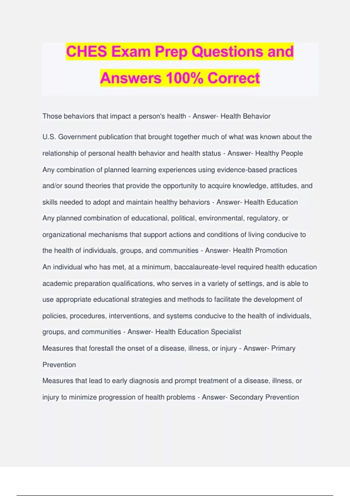 CHES Exam Prep Questions and Answers 100% Correct Those behaviors that impact a person's health - Answer- Health Behavior U.S. Government publication that brought together much of what was known about the relationship of personal health behavior and health status - Answer- Healthy People Any combination of planned learning experiences using evidence-based practices and/or sound theories that provide the opportunity to acquire knowledge, attitudes, and skills needed to adopt and maintain healthy behaviors - Answer- Health Education Any planned combination of educational, political, environmental, regulatory, or organizational mechanisms that support actions and conditions of living conducive to the health of individuals, groups, and communities - Answer- Health Promotion An individual who has met, at a minimum, baccalaureate-level required health education academic preparation qualifications, who serves in a variety of settings, and is able to use appropriate educational strategies and methods to facilitate the development of policies, procedures, interventions, and systems conducive to the health of individuals, groups, and communities - Answer- Health Education Specialist Measures that forestall the onset of a disease, illness, or injury - Answer- Primary Prevention Measures that lead to early diagnosis and prompt treatment of a disease, illness, or injury to minimize progression of health problems - Answer- Secondary Prevention Measures aimed at rehabilitation following significant disease, illness, or injury - Answer- Tertiary Prevention Started in 1979; yielded a generic role for the entry-level health educator - Answer- Role Delineation Project Any person, community, or organization with a vested interest in a program - Answer- Stakeholders Those who have the authority to approve a plan - Answer- Decision Makers A collective body of individuals identified by common characteristics such as geography, interests, experiences, concerns, or values - Answer- Community Those for whom the program is intended to serve - Answer- Priority Population Assessing Needs, Setting Goals/objectives, Developing an intervention, Implementing the intervention, Evaluating the results - Answer- Steps of Generalized Model Measure of actual and potential individual, group, and community resources that can be inherent to and/or brought to bear for health maintenance and enhancement. - Answer- Capacity Assessment Systematic identification of needs within a population and the determination of the degree to which those needs are being met - Answer- Needs Assessment Conditions in which people are born, live, work, play, and age that affect their health risk, health, daily functioning, and quality of life - Answer- Social Determinants of Health Particular type of health difference that is closely linked with social, economic, and/or environmental disadvantage - Answer- Health Disparities Attainment of highest level of health for all people - Answer- Health Equit