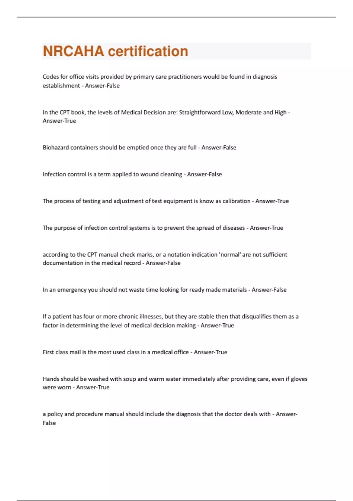 Codes for office visits provided by primary care practitioners would be found in diagnosis establishment - Answer-False In the CPT book, the levels of Medical Decision are: Straightforward Low, Moderate and High - Answer-True Biohazard containers should be emptied once they are full - Answer-False Infection control is a term applied to wound cleaning - Answer-False The process of testing and adjustment of test equipment is know as calibration - Answer-True The purpose of infection control systems is to prevent the spread of diseases - Answer-True according to the CPT manual check marks, or a notation indication 'normal' are not sufficient documentation in the medical record - Answer-False In an emergency you should not waste time looking for ready made materials - Answer-False If a patient has four or more chronic illnesses, but they are stable then that disqualifies them as a factor in determining the level of medical decision making - Answer-True First class mail is the most used class in a medical office - Answer-True Hands should be washed with soup and warm water immediately after providing care, even if gloves were worn - Answer-True a policy and procedure manual should include the diagnosis that the doctor deals with - AnswerFalseThe best method of scheduling appointments differs from office to office depending on the goals of the physician and staff - Answer-True The most effective tool that the medical office can have as a guiding principle of maintaining high standards is a good office manager - Answer-False A description of the steps that should be utilized to handle a specific situation or to perform a certain task should be included in a procedure manual - Answer-True