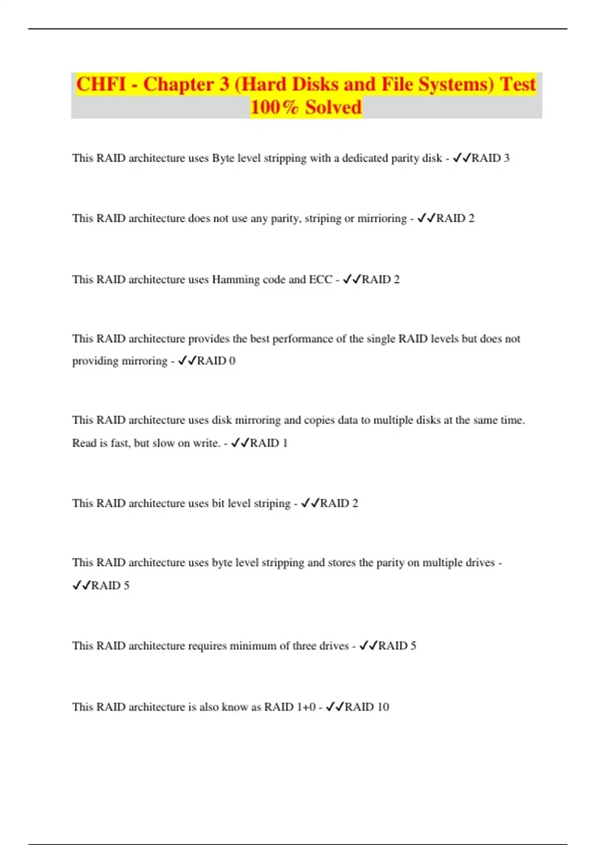 This RAID architecture uses Byte level stripping with a dedicated parity disk - RAID 3 This RAID architecture does not use any parity, striping or mirrioring - RAID 2 This RAID architecture uses Hamming code and ECC - RAID 2 This RAID architecture provides the best performance of the single RAID levels but does not providing mirroring - RAID 0 This RAID architecture uses disk mirroring and copies data to multiple disks at the same time. Read is fast, but slow on write. - RAID 1 This RAID architecture uses bit level striping - RAID 2 This RAID architecture uses byte level stripping and stores the parity on multiple drives - RAID 5 This RAID architecture requires minimum of three drives - RAID 5 This RAID architecture is also know as RAID 1+0 - RAID 10This RAID architecture uses at least four drives - RAID 10 The reserved area on a HDD, meant to store data in a way that the user, BIOS, or OS cannot modify, change, or access it. Information about HDD utilities, diagnostic tools, boot sector code, etc. is found here. - Host Protected Areas (HPA) An additional hidden area which enables system vendors to buy HDDs of varying sizes from different manufacturers and configure all of them to have an equal number of sectors. It can also be used to enable/disable features on the HDD. - Device Configuration Overlays (DCO) Use this command to identify DCO (Devies Config Overlays) - DEVICE_CONFIGURATION_IDENTIFY The three ATA commands that can help users to create and use a hidden protected area are: - IDENTIFY DEVICE; SET MAX ADDRESS; READ NATIVE MAX ADDRESS This RAID type mirrors disks in PAIRS - RAID 10 ASCII non printable range is? - 0-31